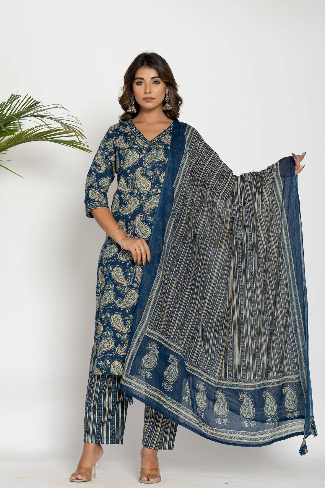 Navy Blue & Beige Paisley Printed Cotton Suit Set - Kurti, Pant & Dupatta