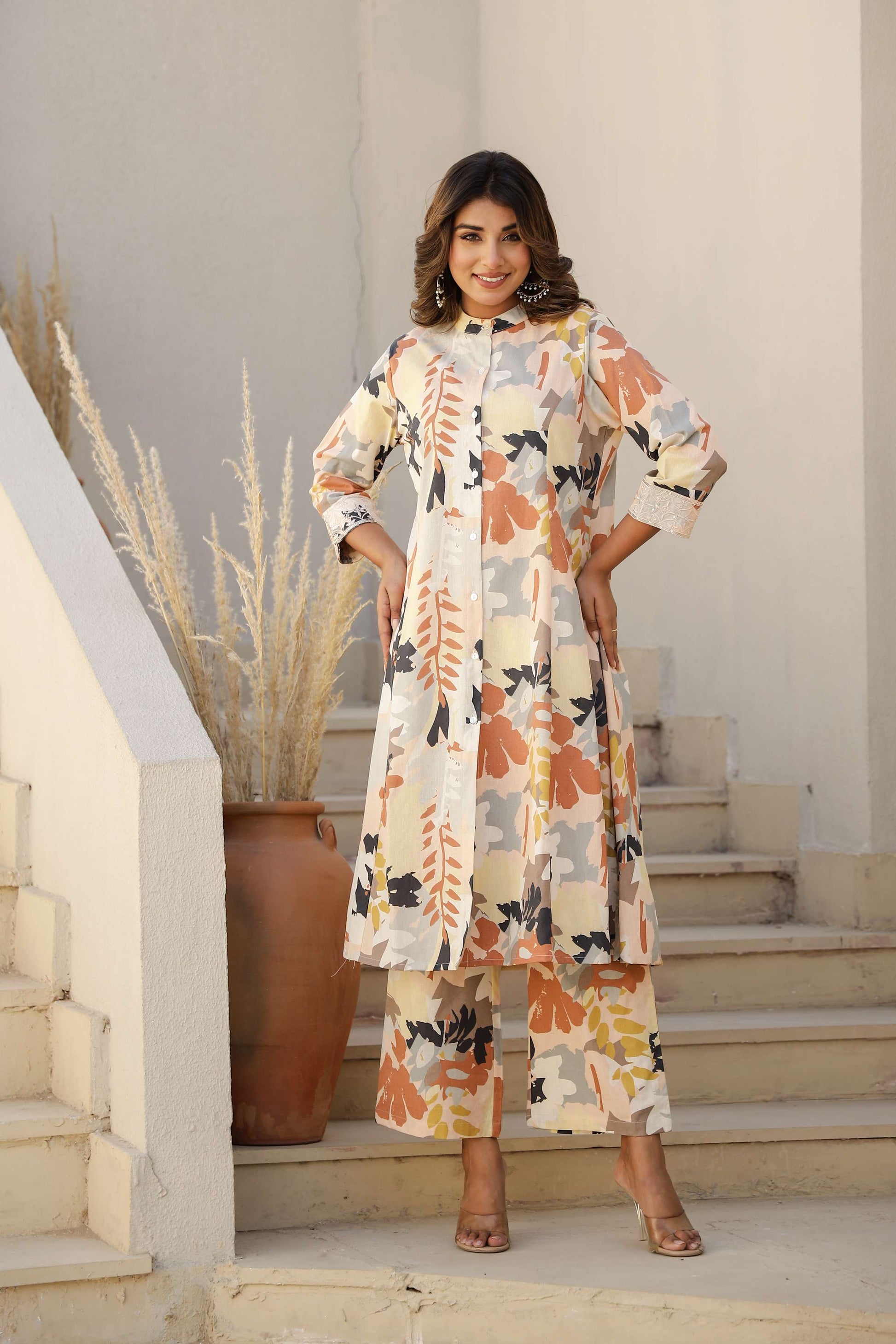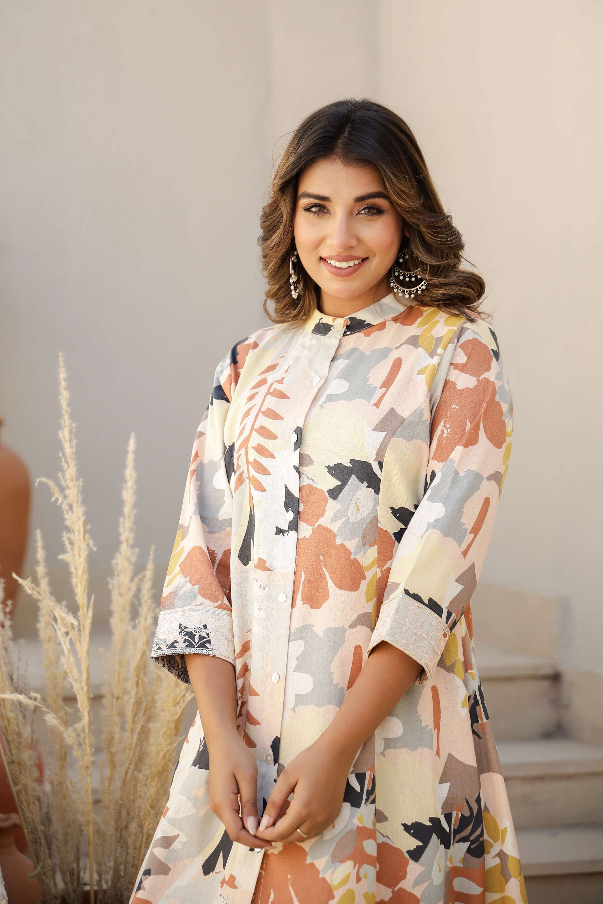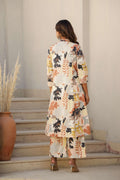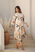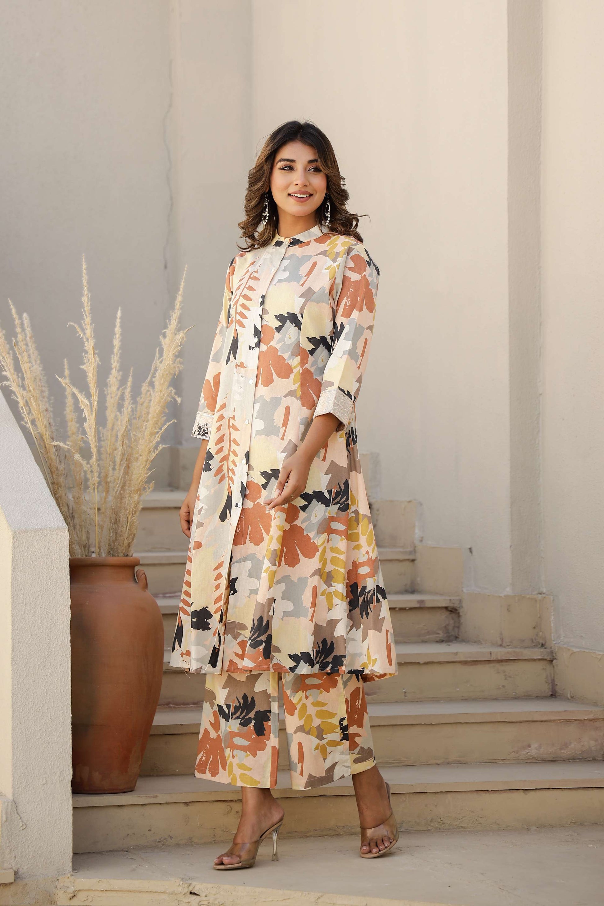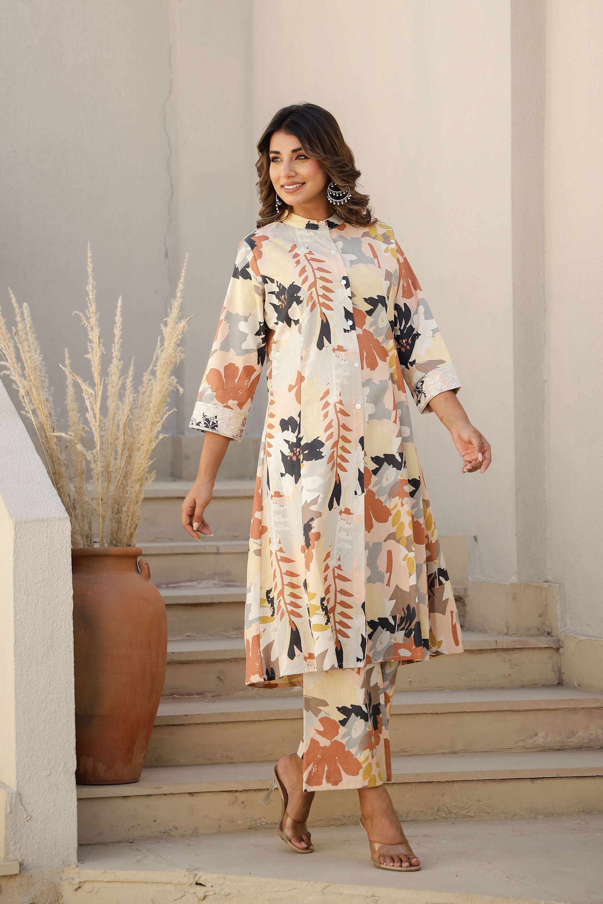 Cotton Flax A-Line Kurta Set with Handcrafted Detailing – Black & Rust Print