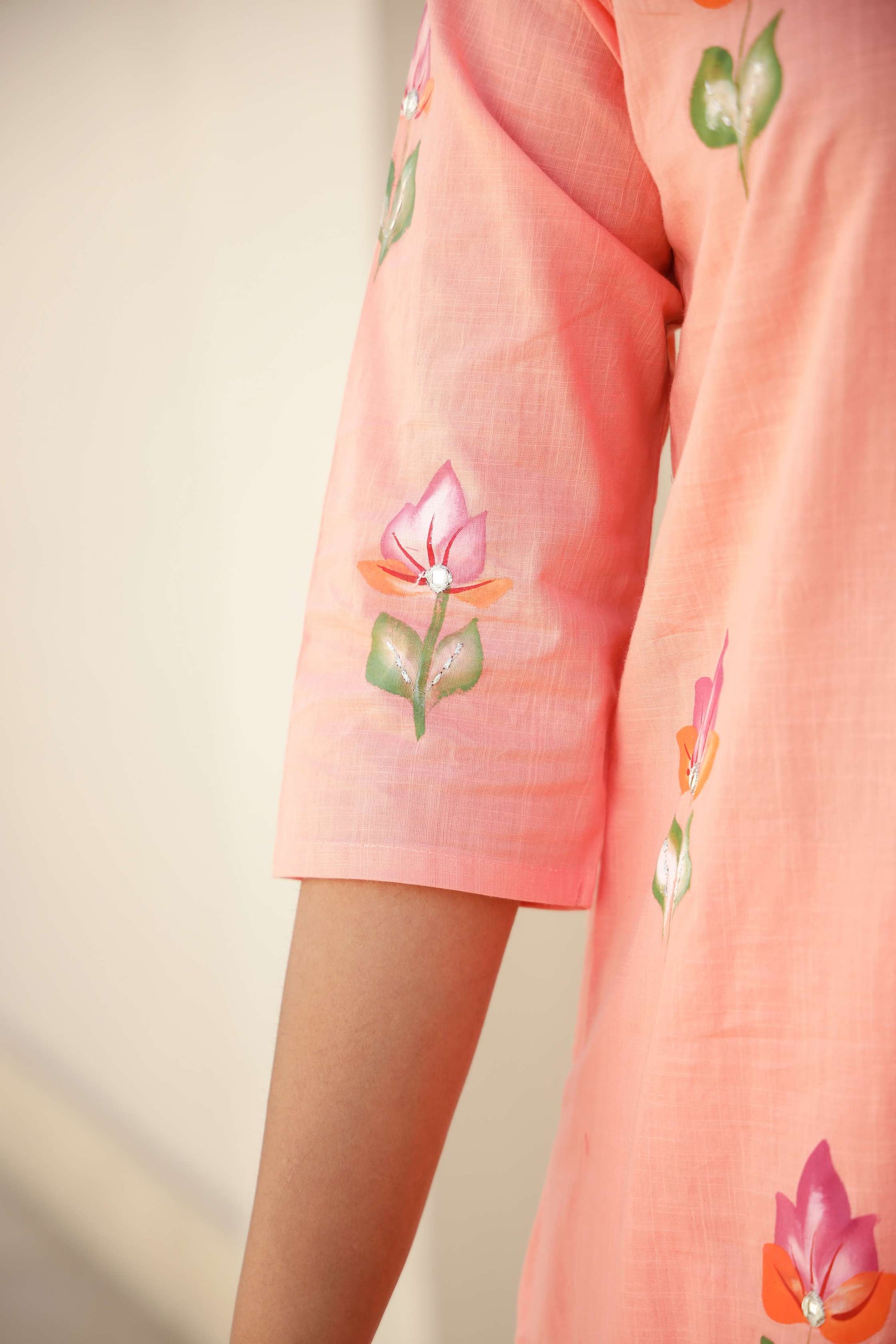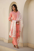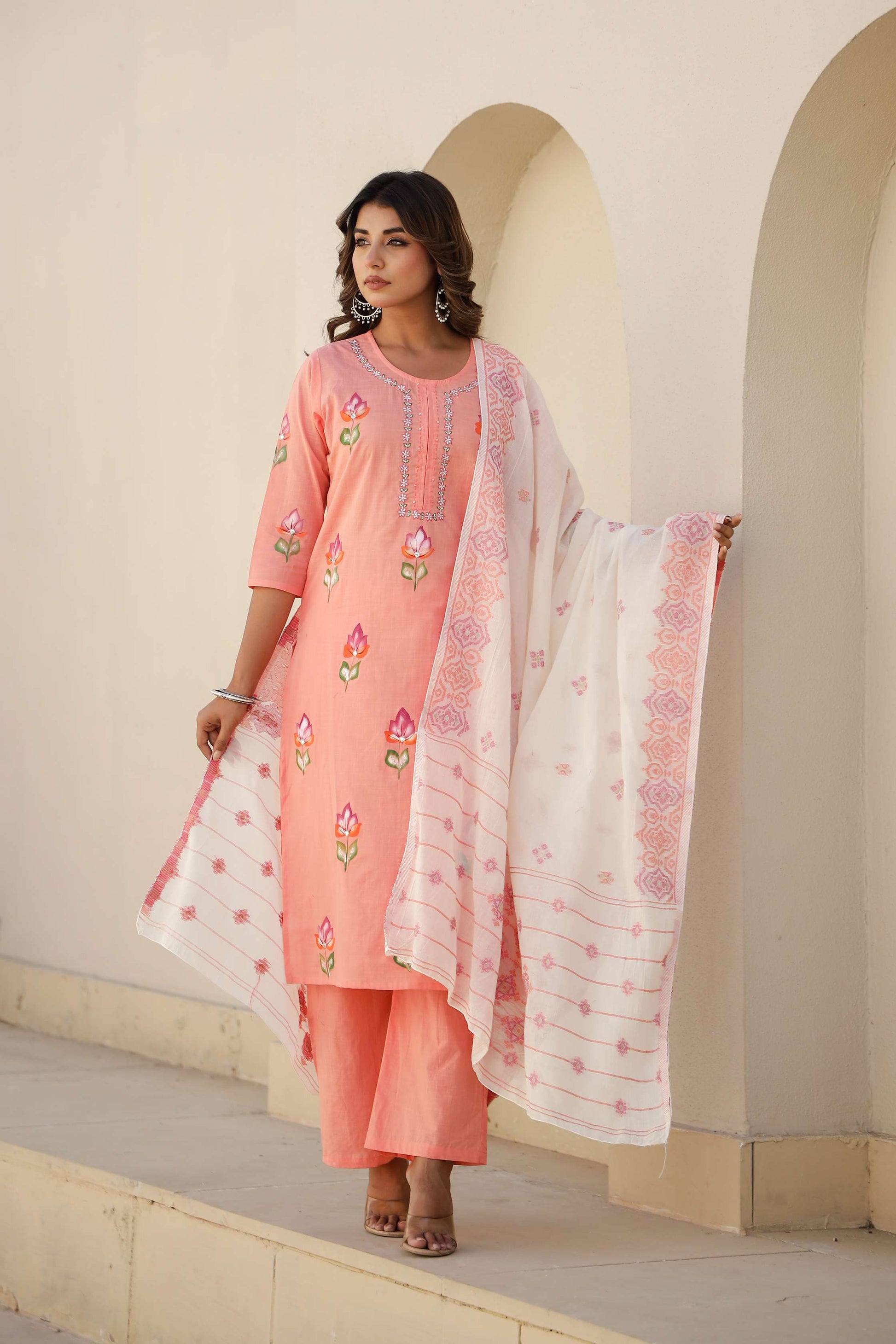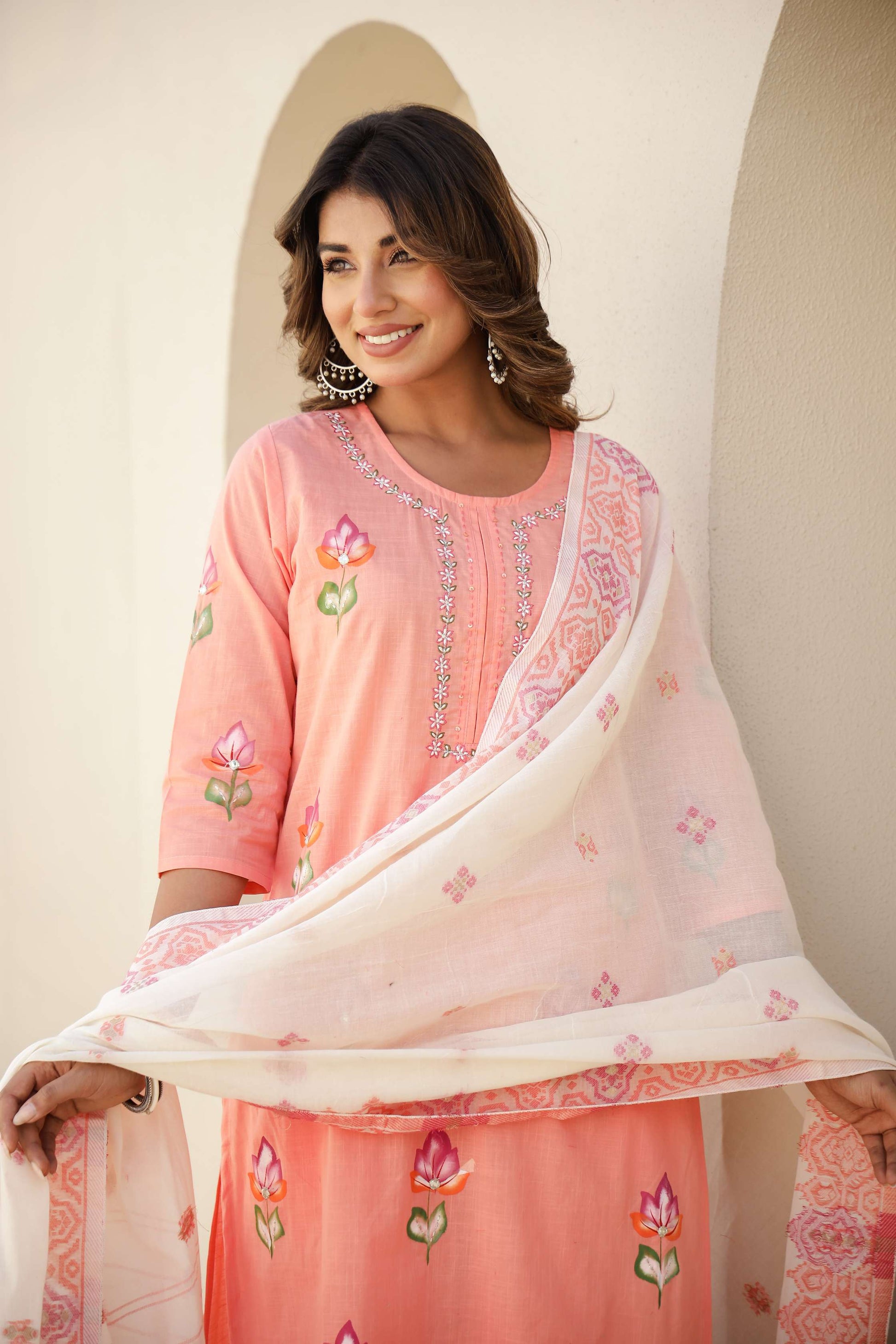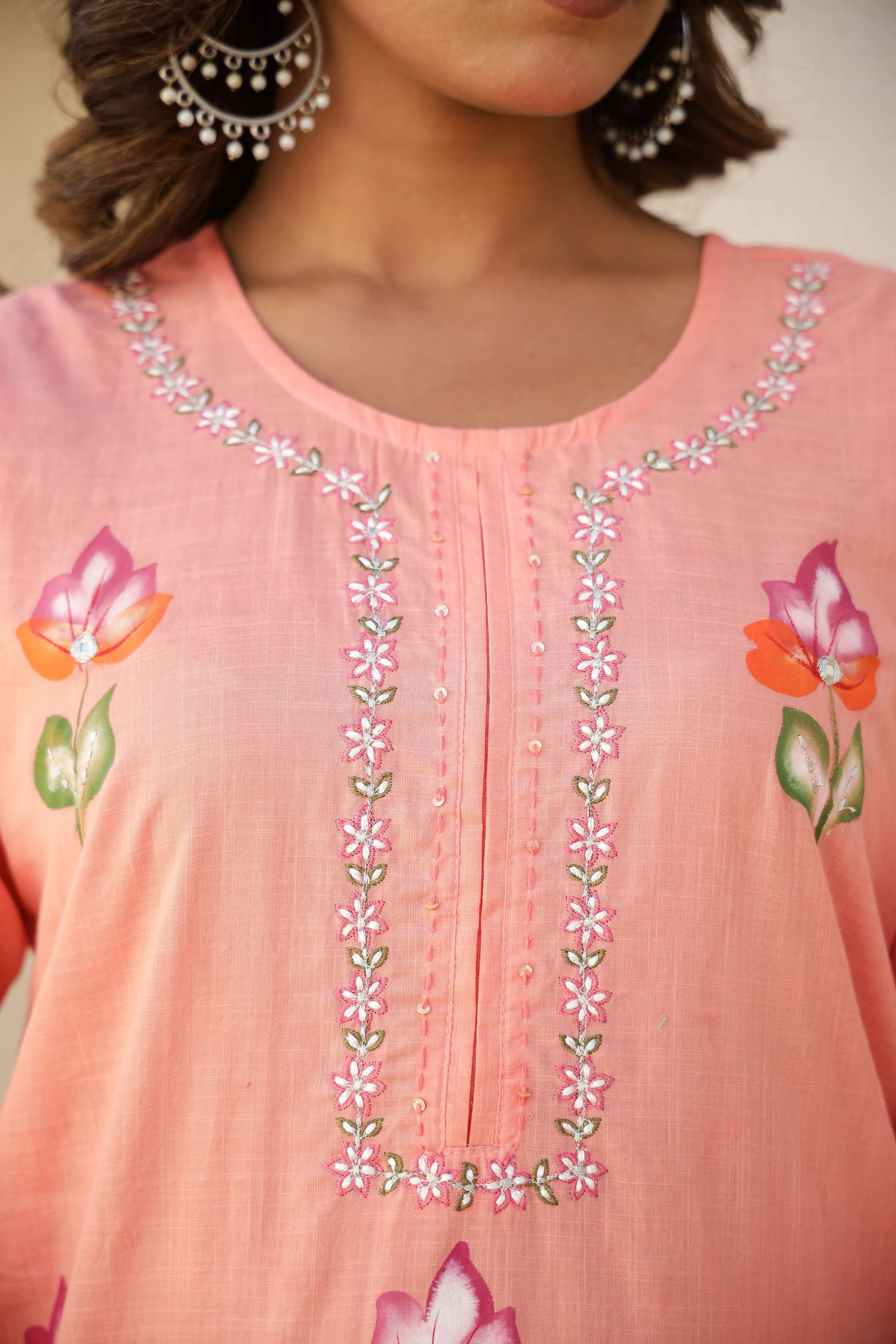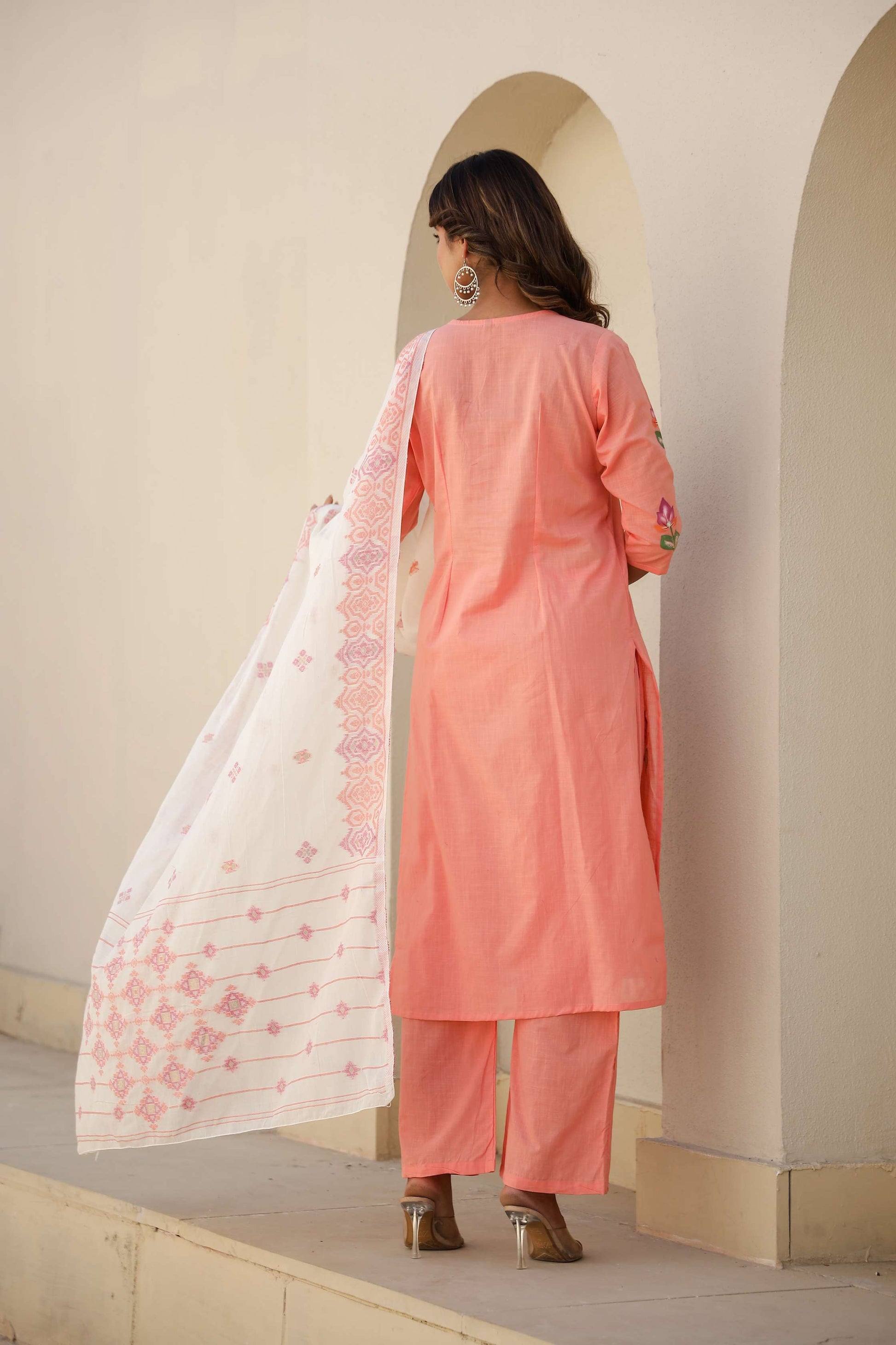 Peach Pink Cotton Kurta Set with Elegant Embroidery