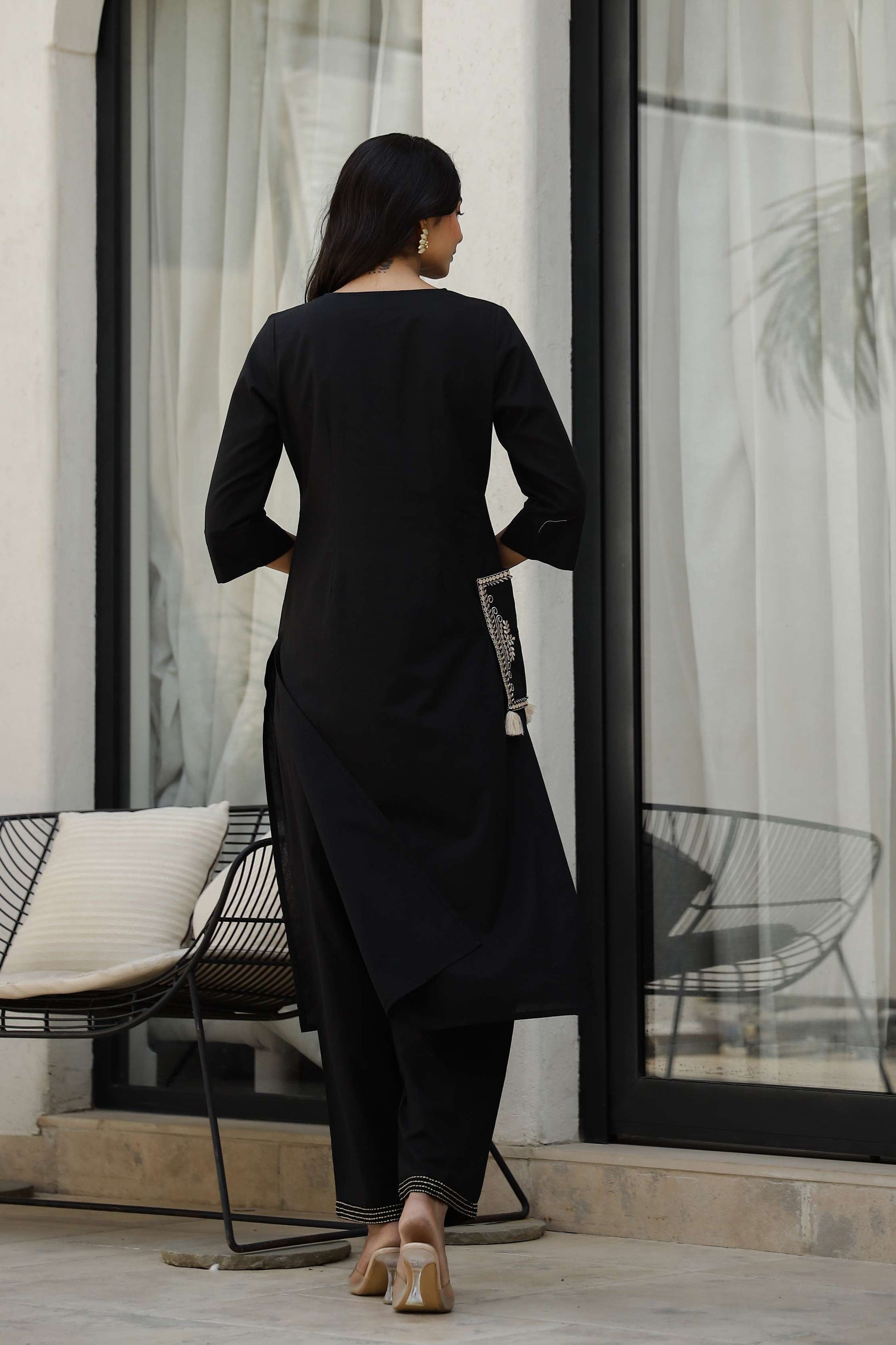 Black Solid Cotton Kurta Set with Embroidered Pocket