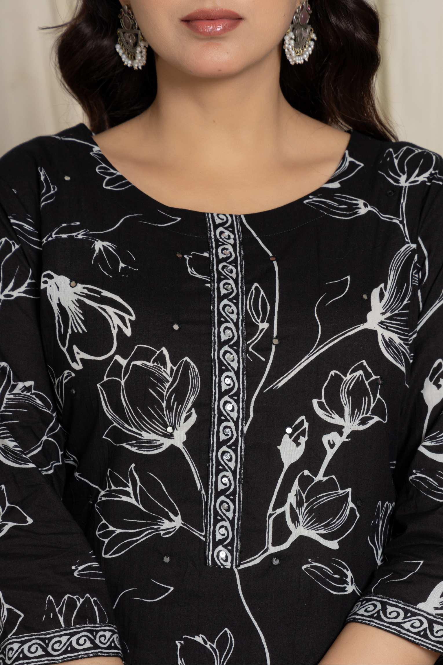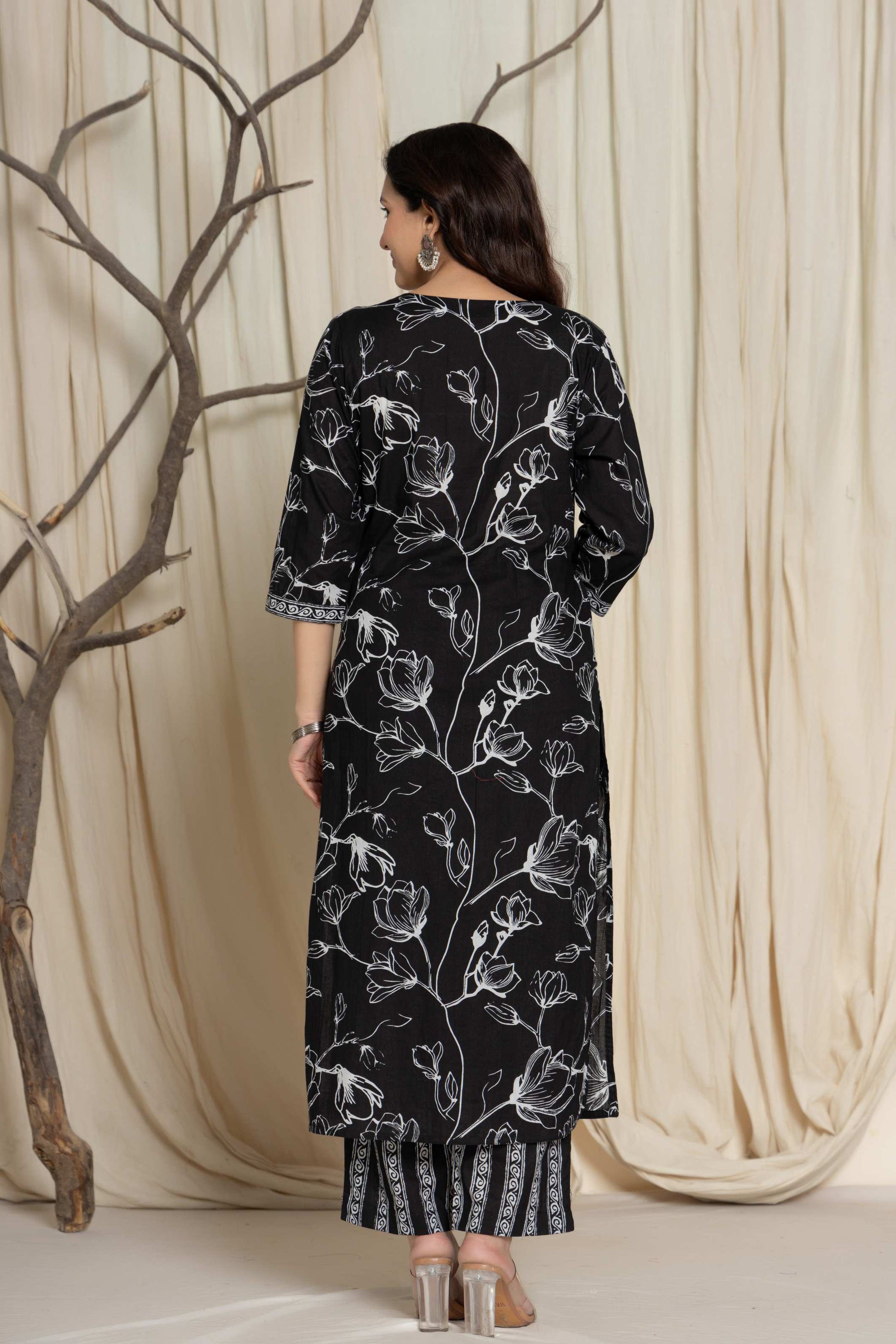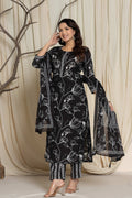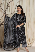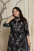 Upgrade your ethnic wardrobe with this beautiful black floral suit set, crafted from premium cotton fabric for ultimate comfort. The set features intricate prints and elegant design, making it a perfect choice for casual outings, festive occasions, or office wear.