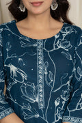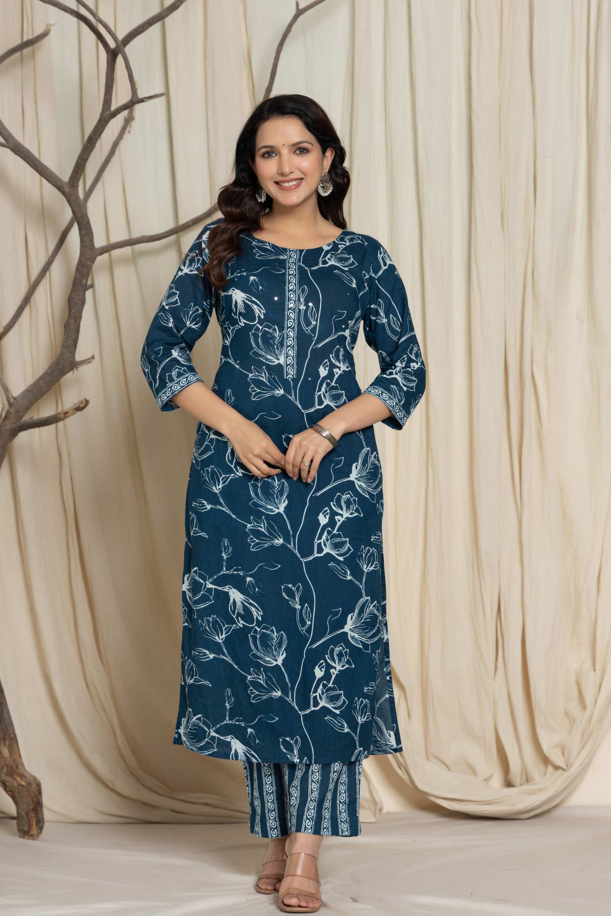 Upgrade your ethnic wardrobe with this beautiful blue floral suit set, crafted from premium cotton fabric for ultimate comfort. The set features intricate prints and elegant design, making it a perfect choice for casual outings, festive occasions, or office wear.