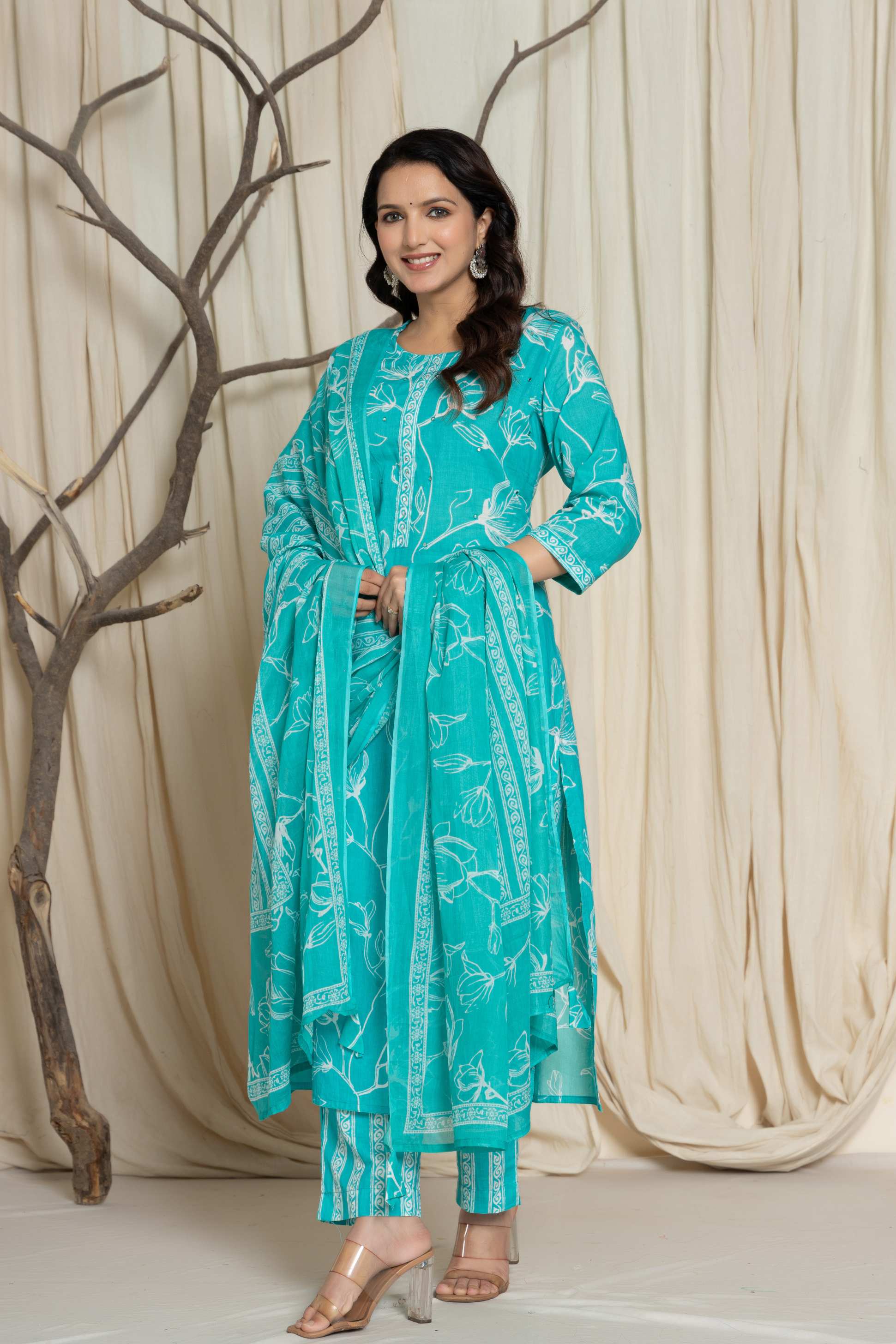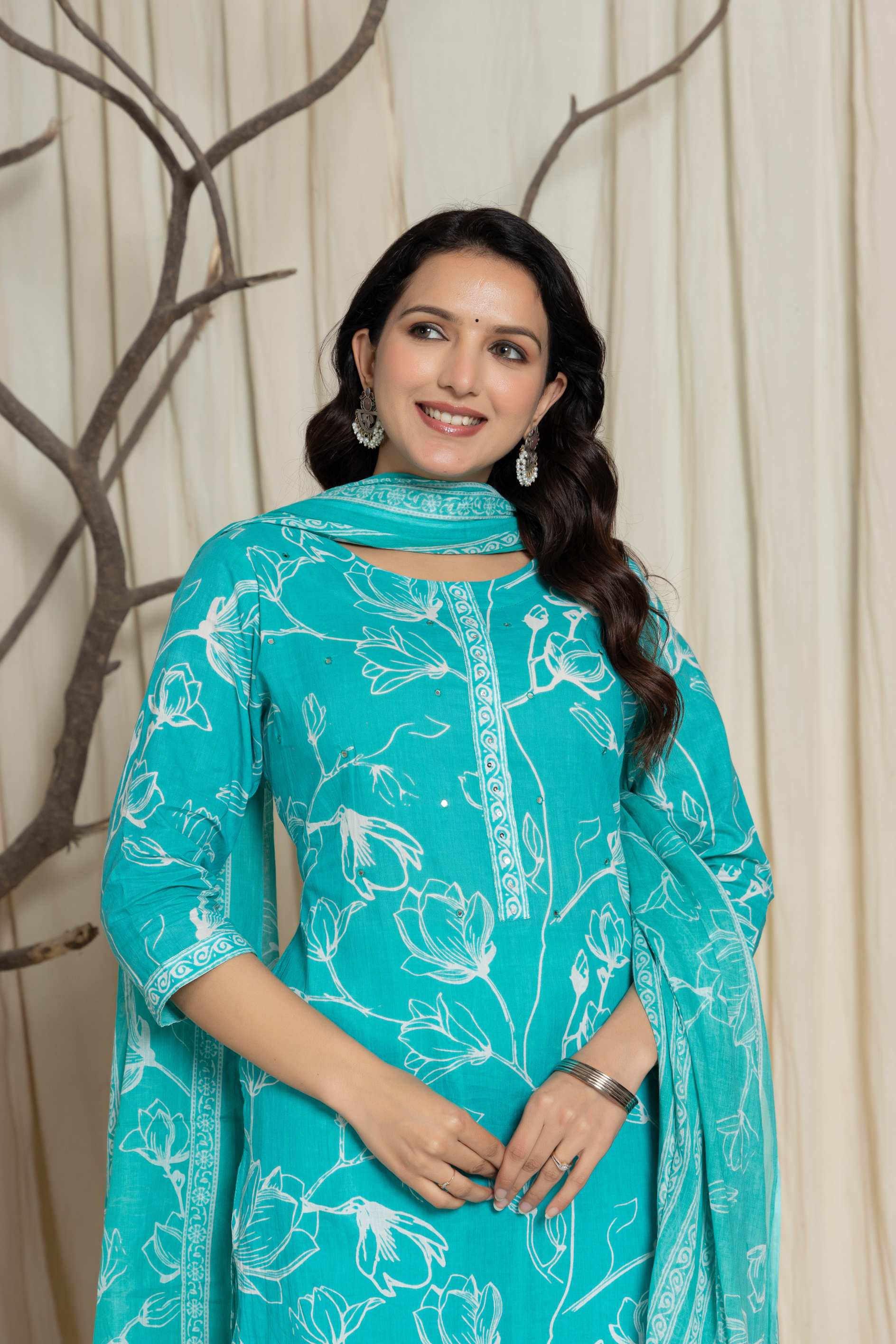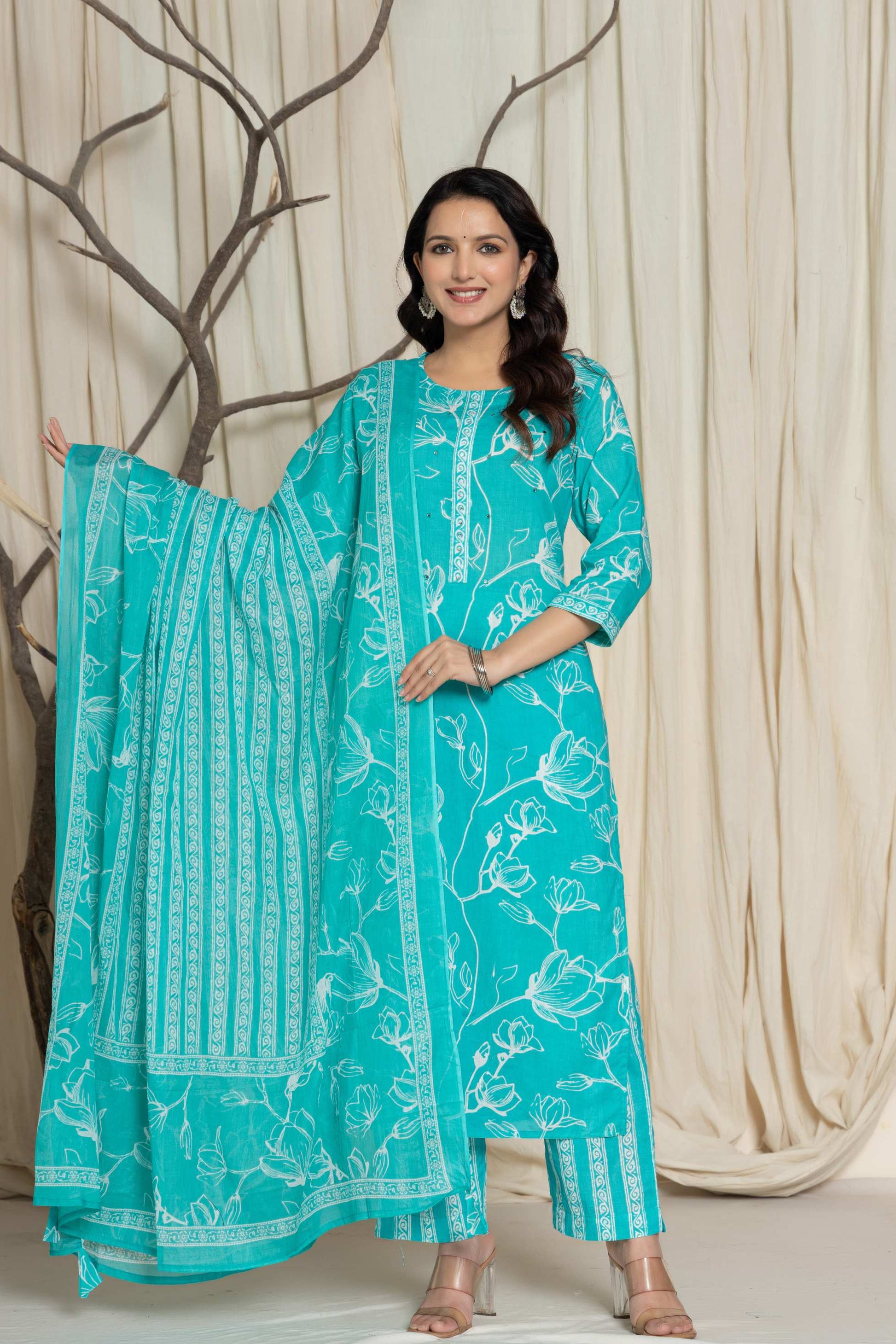Upgrade your ethnic wardrobe with this beautiful green floral suit set, crafted from premium cotton fabric for ultimate comfort. The set features intricate prints and elegant design, making it a perfect choice for casual outings, festive occasions, or office wear.