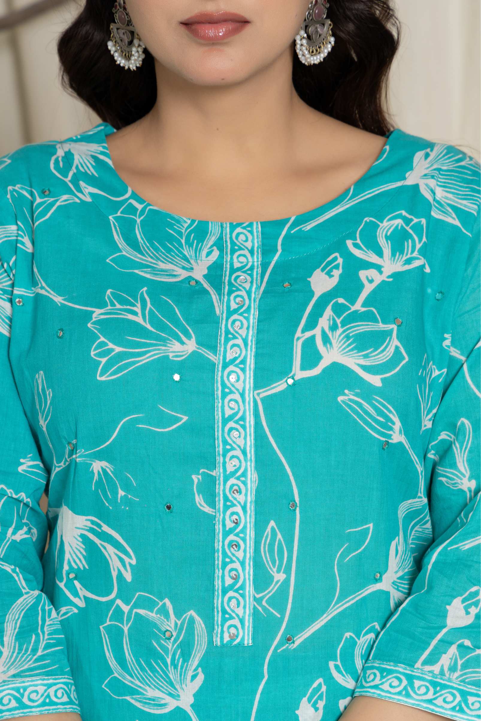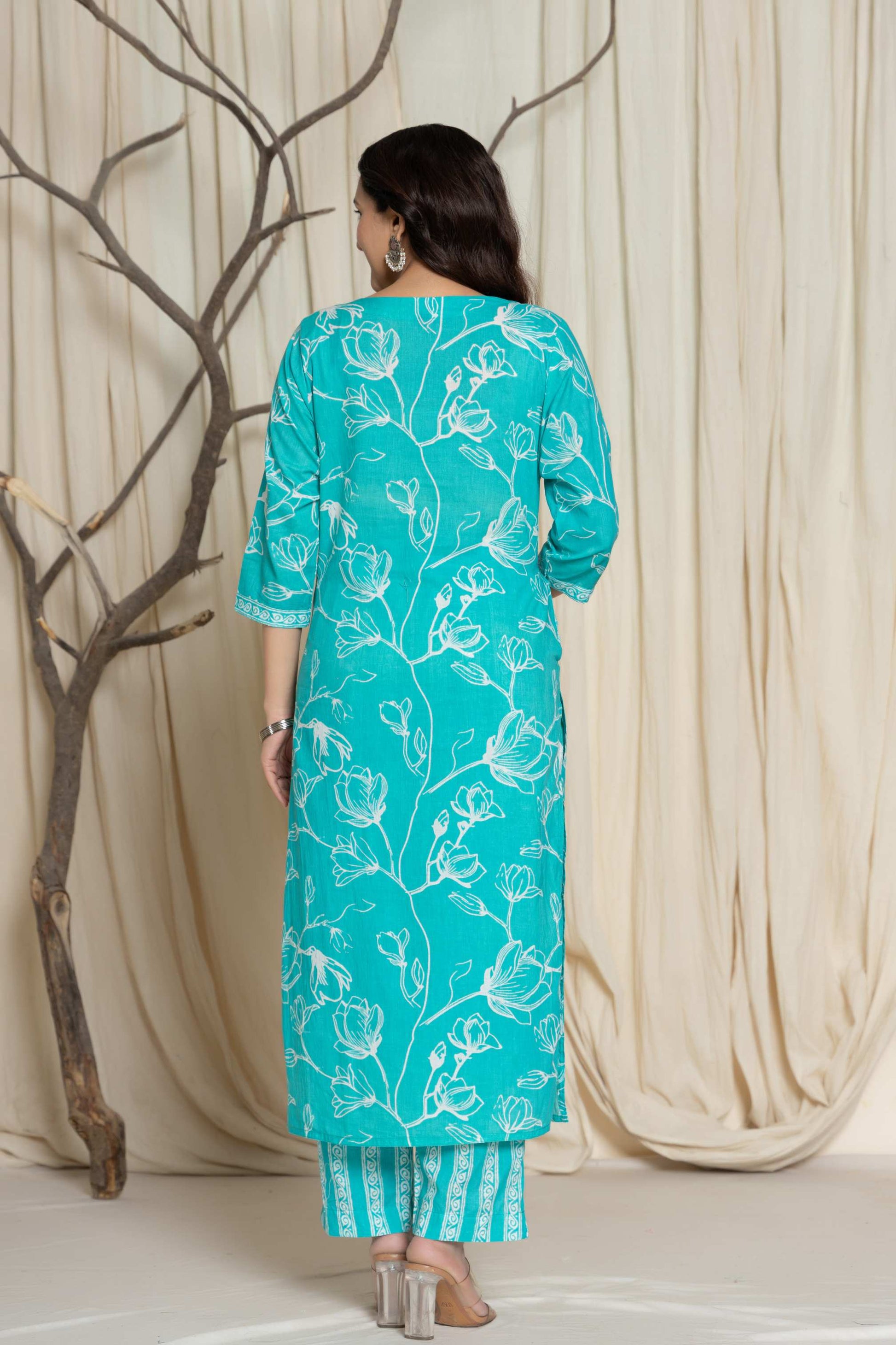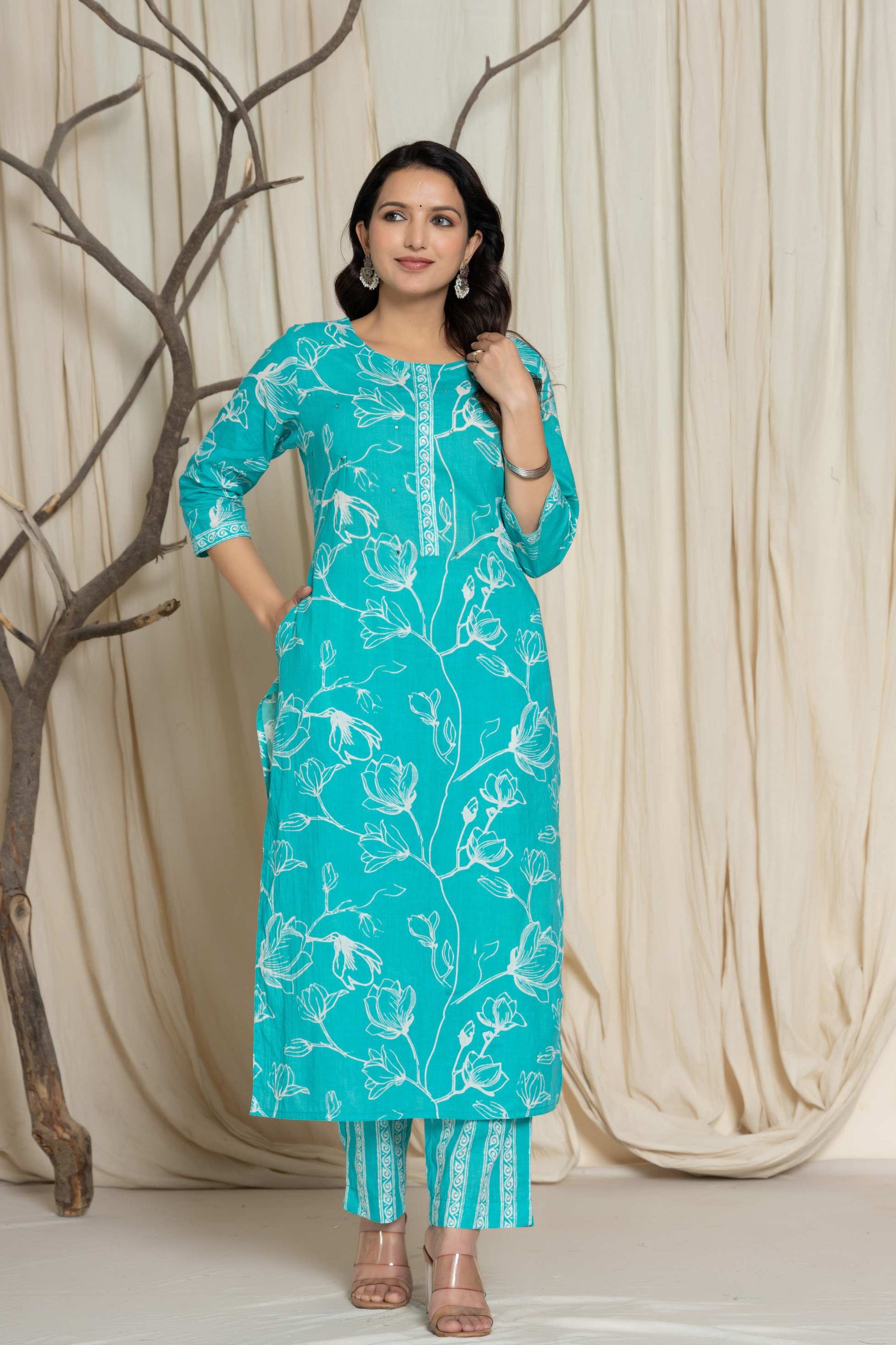 Upgrade your ethnic wardrobe with this beautiful green floral suit set, crafted from premium cotton fabric for ultimate comfort. The set features intricate prints and elegant design, making it a perfect choice for casual outings, festive occasions, or office wear.