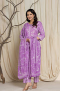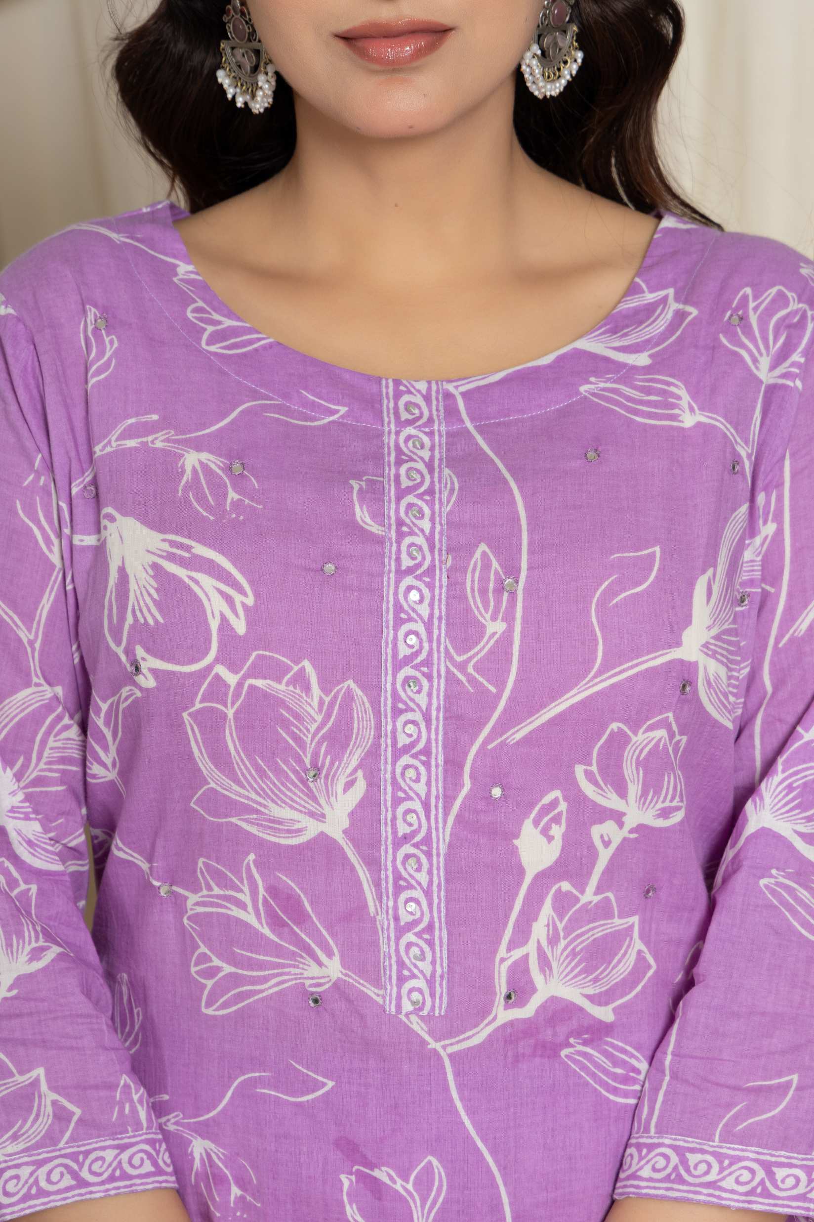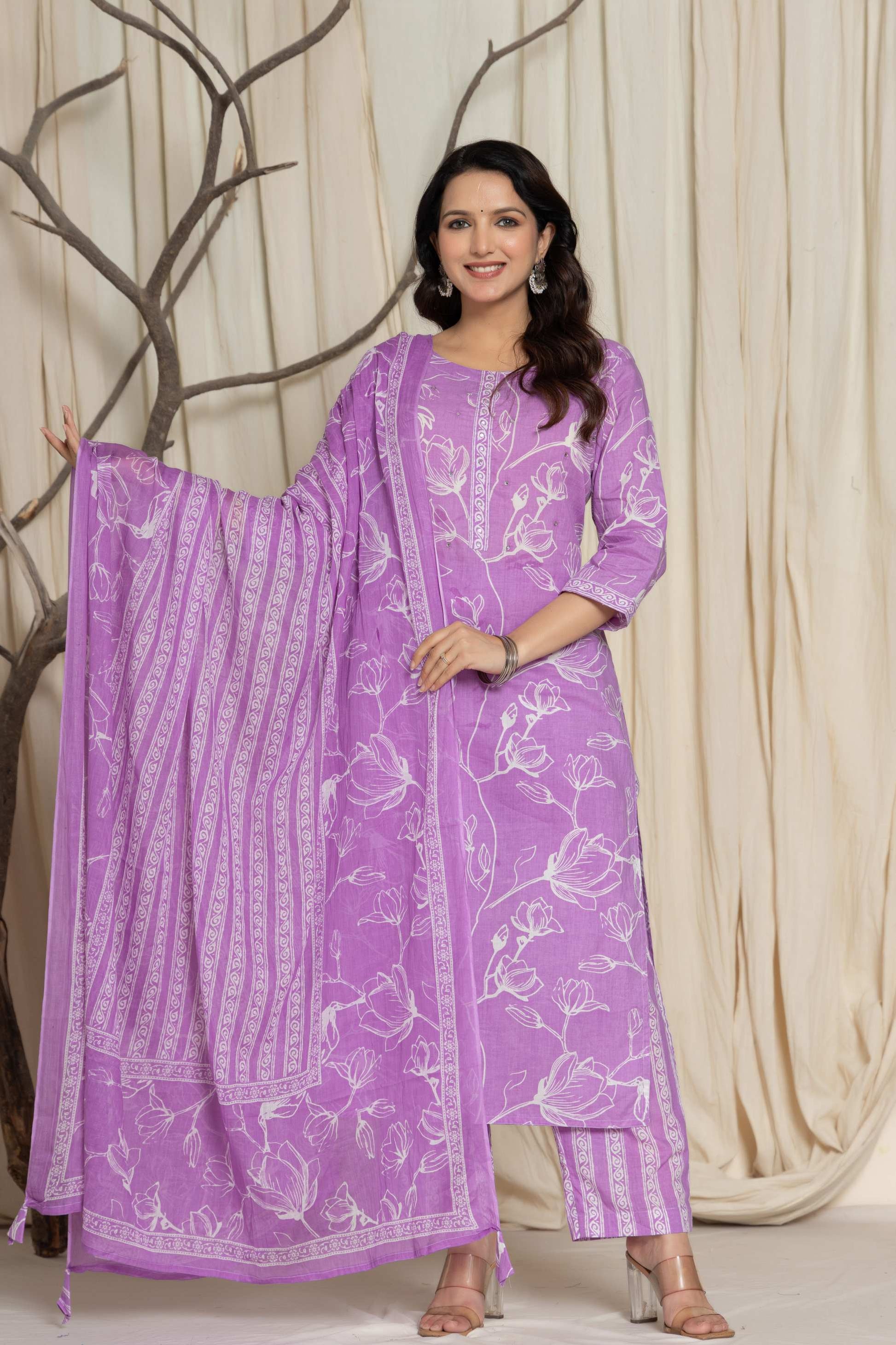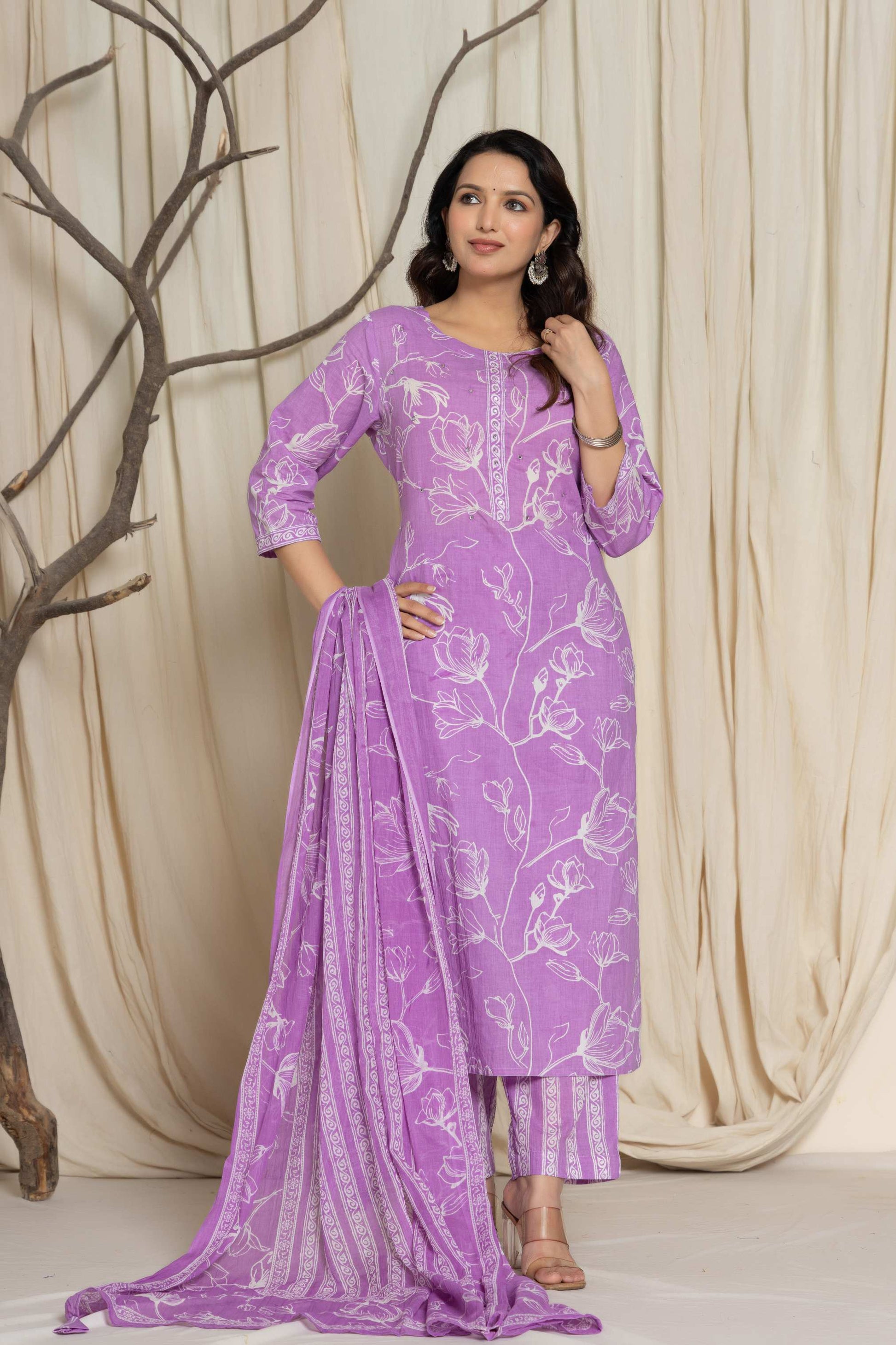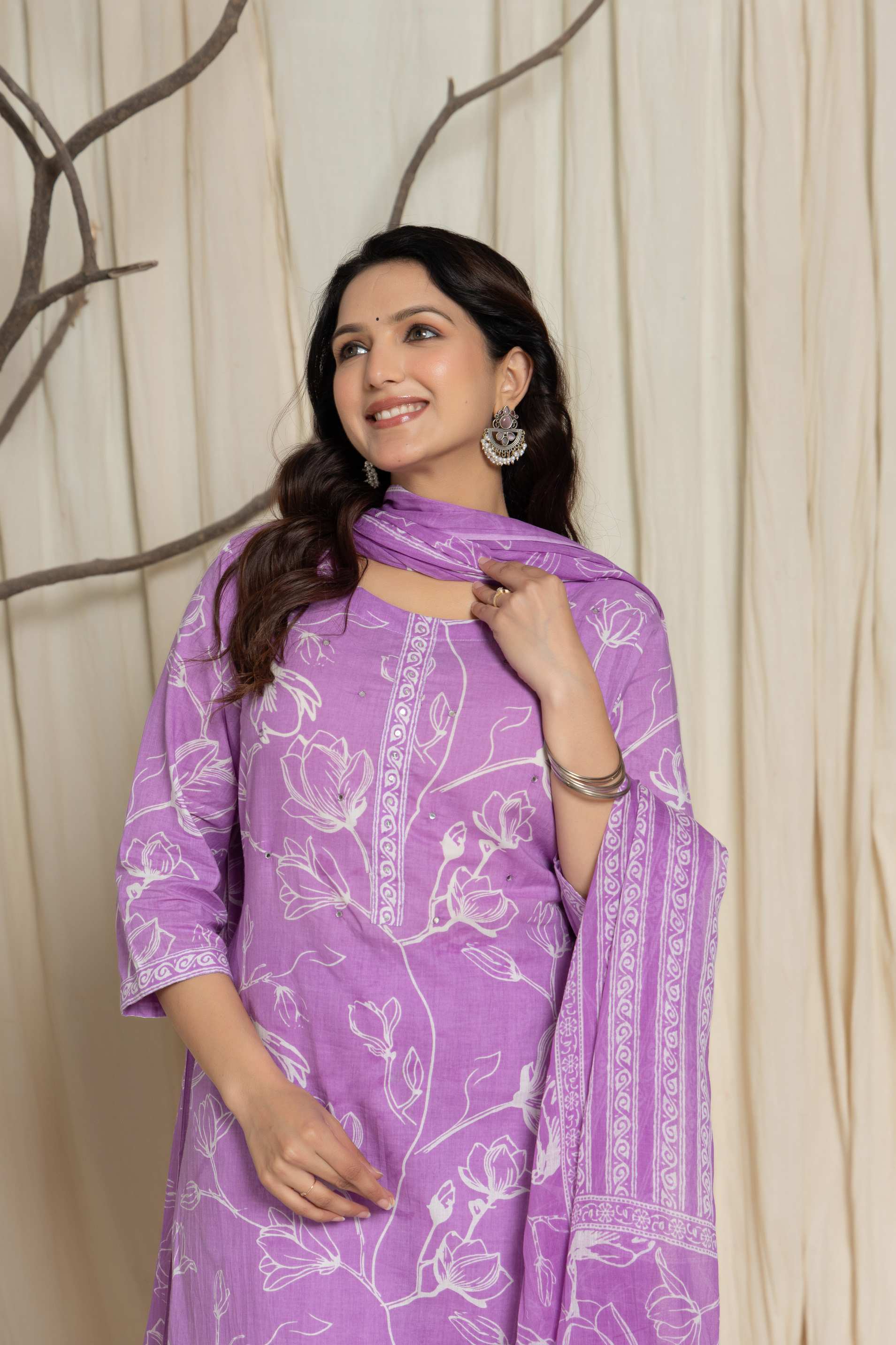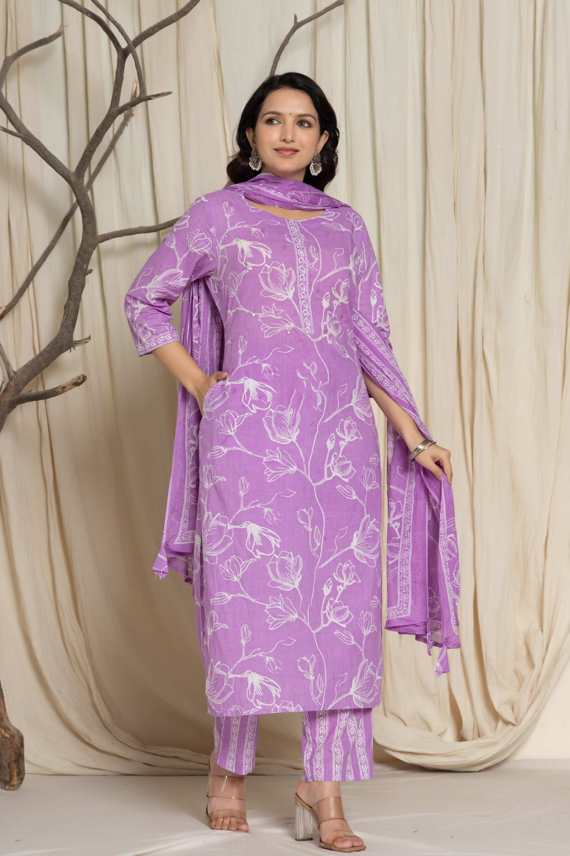 Upgrade your ethnic wardrobe with this beautiful purple floral suit set, crafted from premium cotton fabric for ultimate comfort. The set features intricate prints and elegant design, making it a perfect choice for casual outings, festive occasions, or office wear.