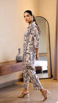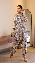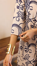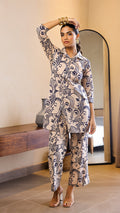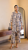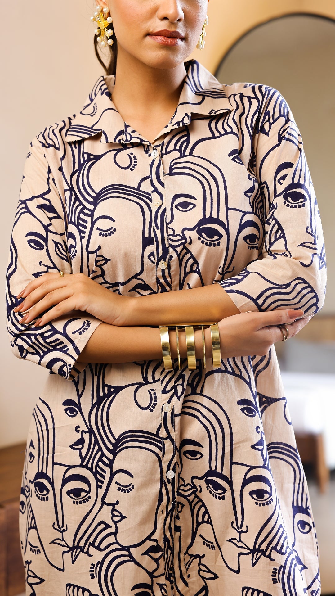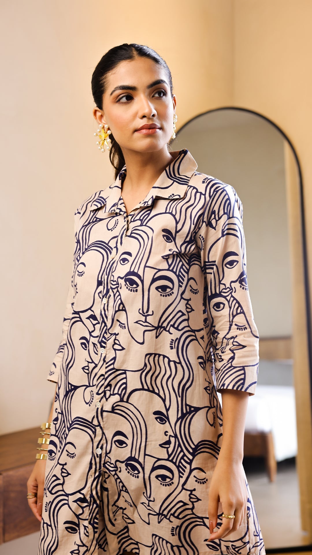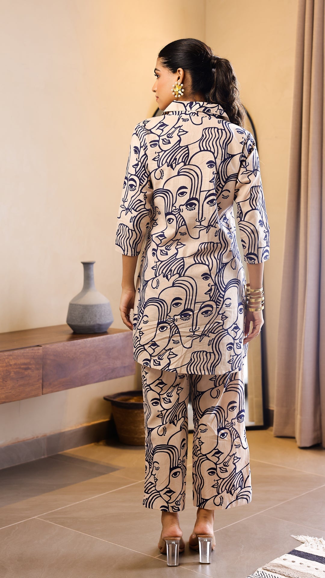 Step into artsy elegance with this beige co-ord set, detailed in striking navy blue abstract face prints. Crafted in breathable cotton-linen, this kurta and pant duo brings comfort with a creative edge—perfect for casual chic and everyday statements.