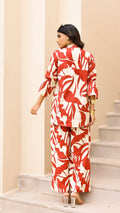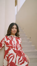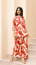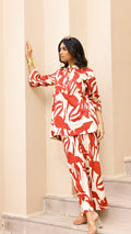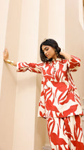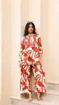 Add a fierce touch to your wardrobe with this red and cream co-ord set featuring a striking abstract print. The relaxed-fit kurta pairs effortlessly with wide-leg pants for an elevated yet easygoing look. Perfect for power dressing with comfort.