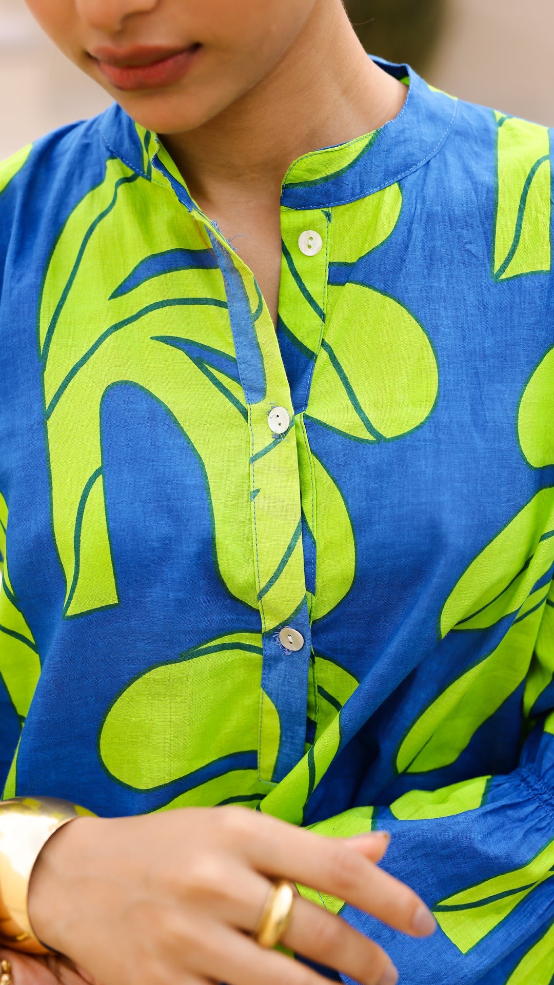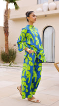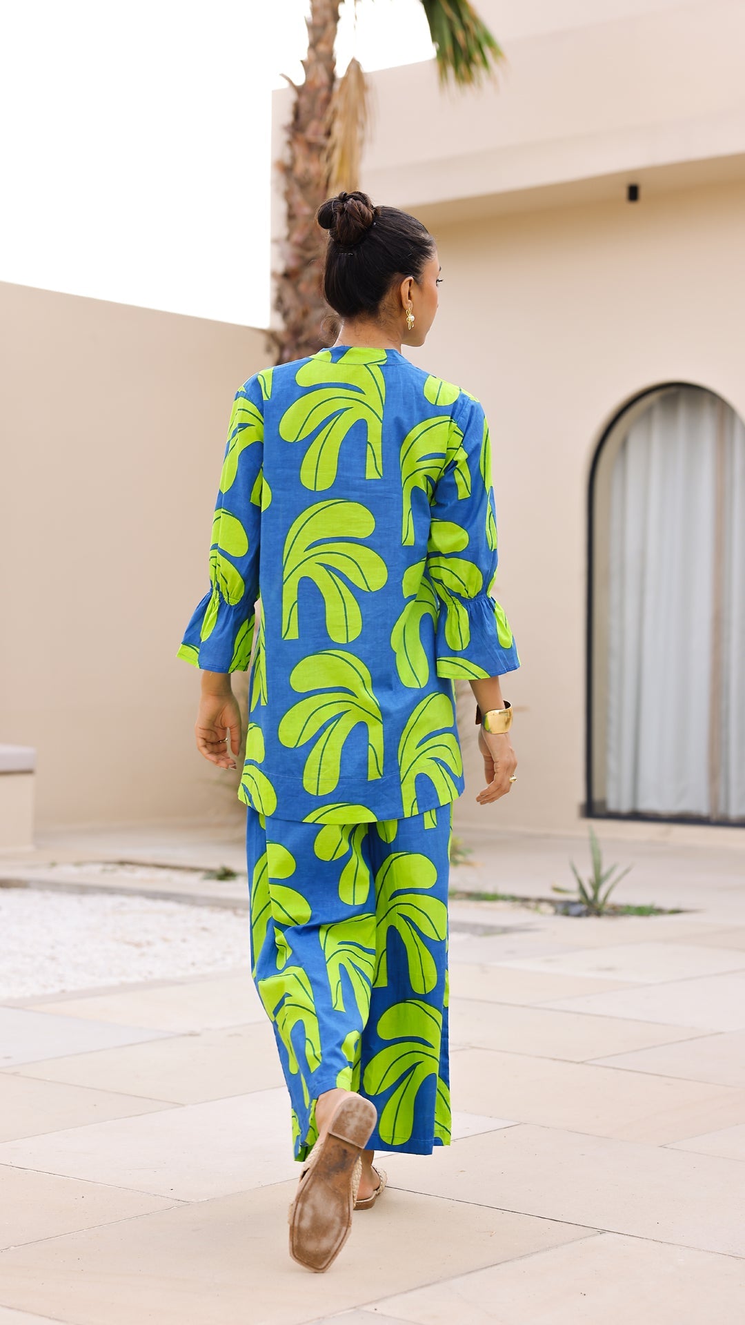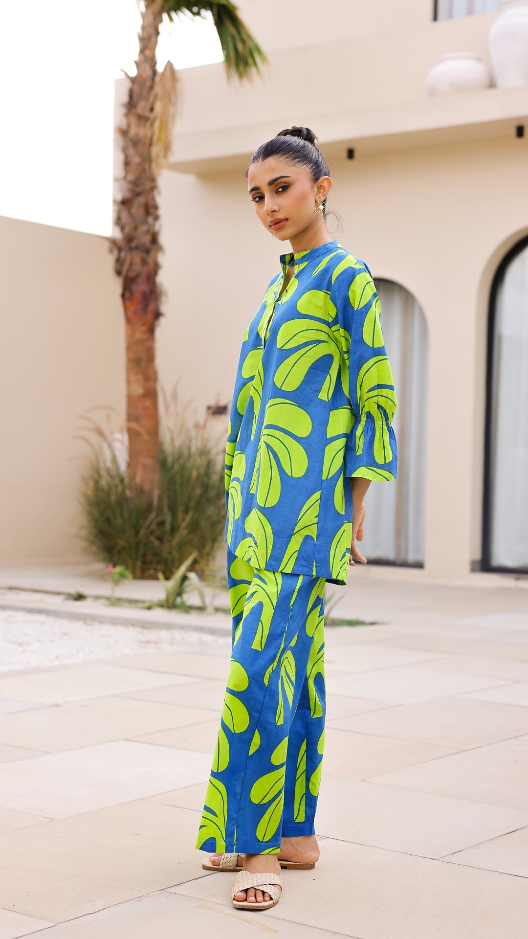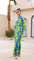 Freshen up your summer wardrobe with this vibrant Blue & Lime Green Tropical Co-Ord Set. Crafted in soft, breathable cotton, this set features a relaxed fit shirt with playful leafy prints and flared trousers for an effortlessly chic look.