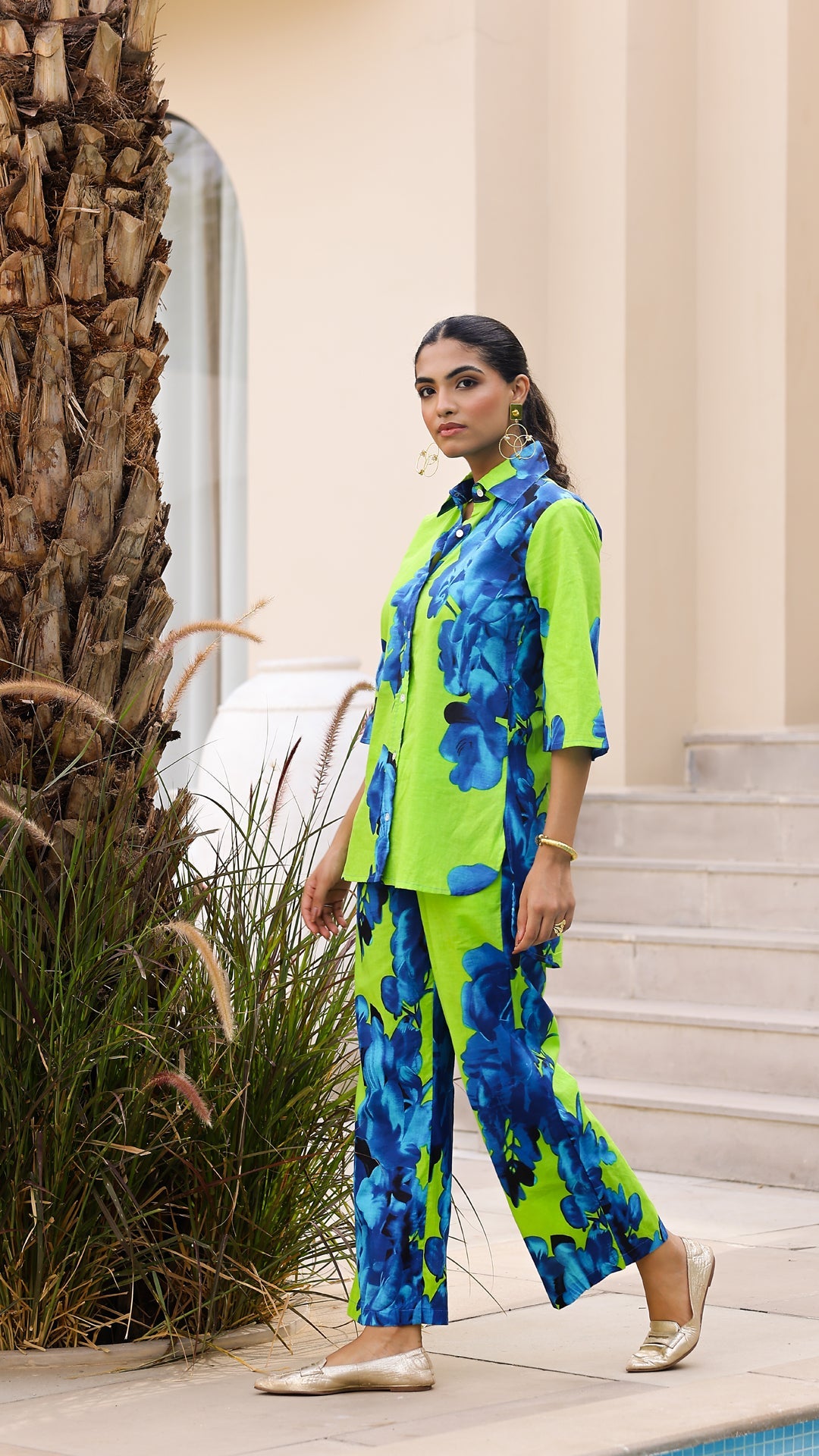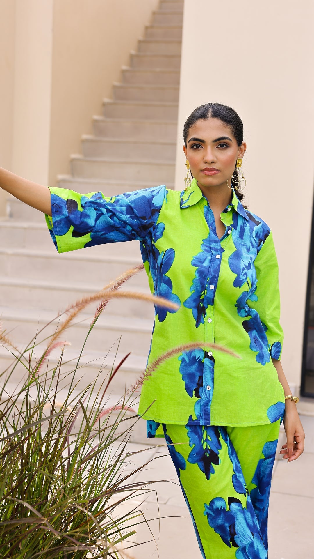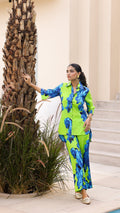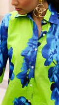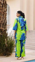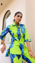 Make a bold statement with our Lime Green & Royal Blue Floral Co-Ord Set. Featuring oversized floral prints on soft cotton fabric, this two-piece outfit is perfect for brunch dates, travel, or lounging in style.