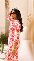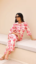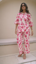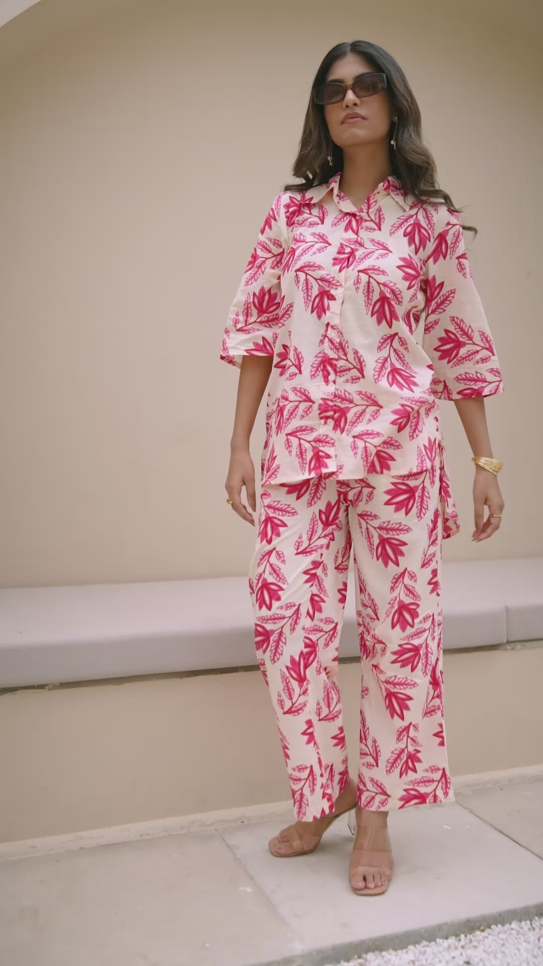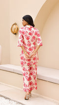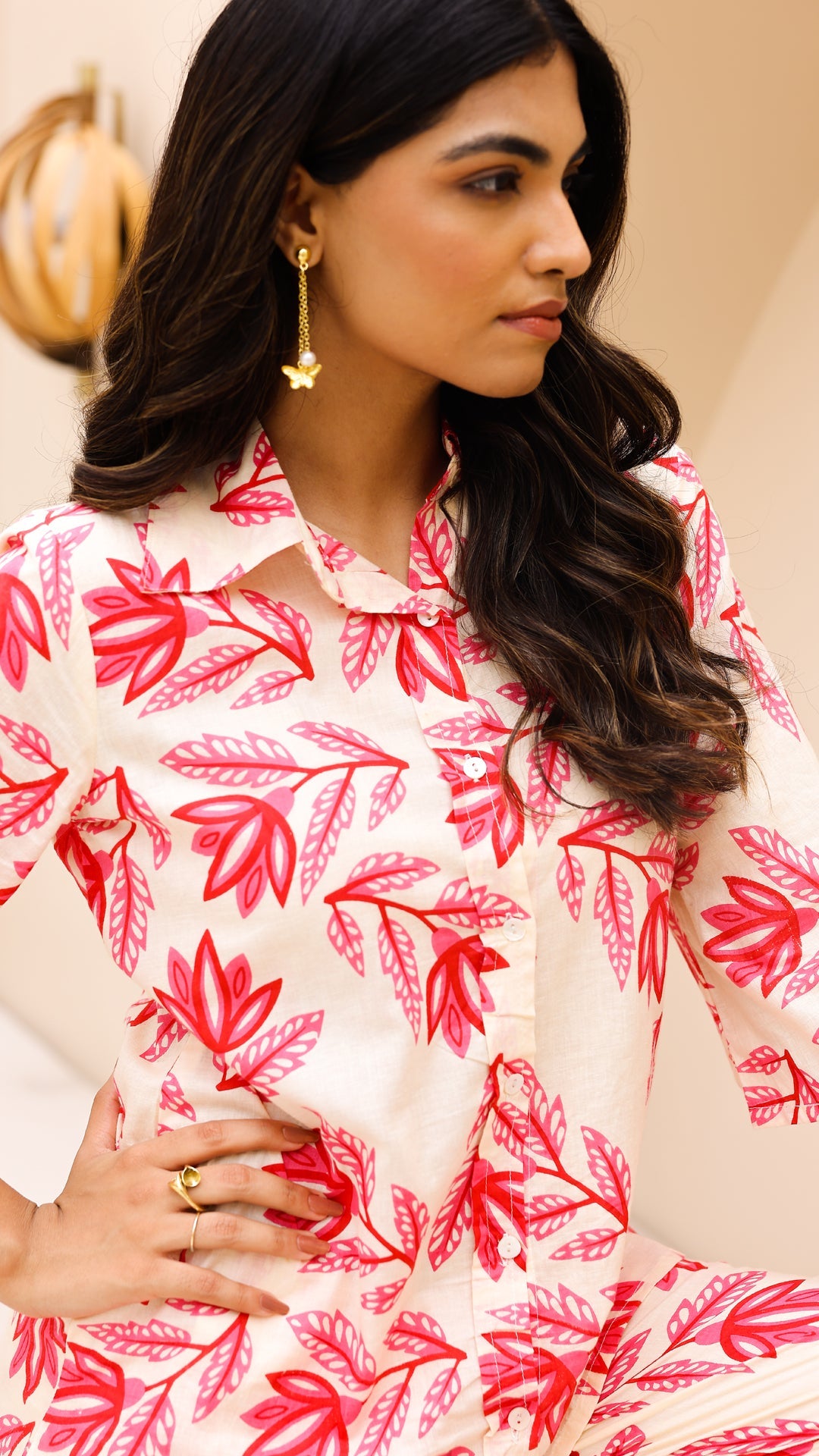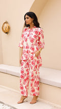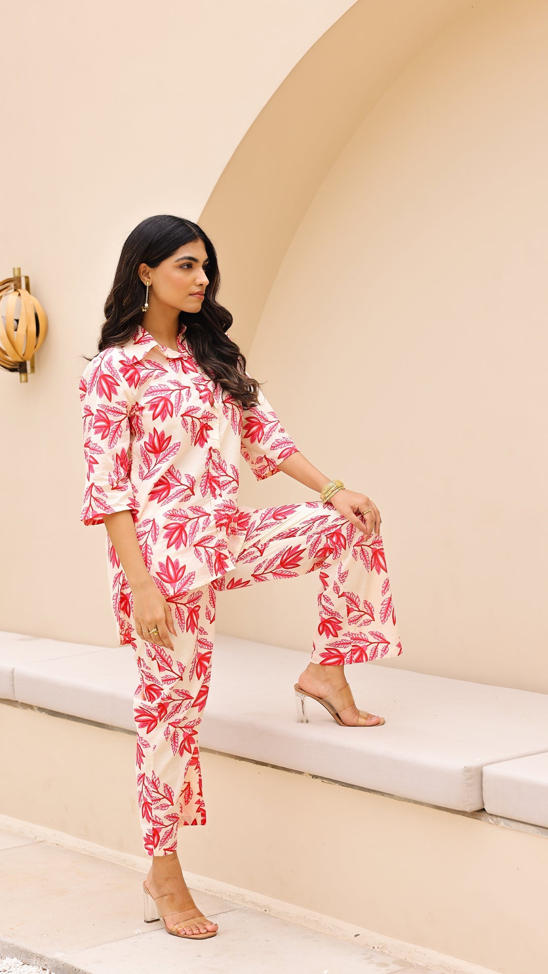 Step into effortless charm with this red-on-cream botanical co-ord set. Featuring a breezy collared top and matching wide-leg pants, this soft cotton outfit is perfect for summer outings, brunch looks, or laid-back luxury.