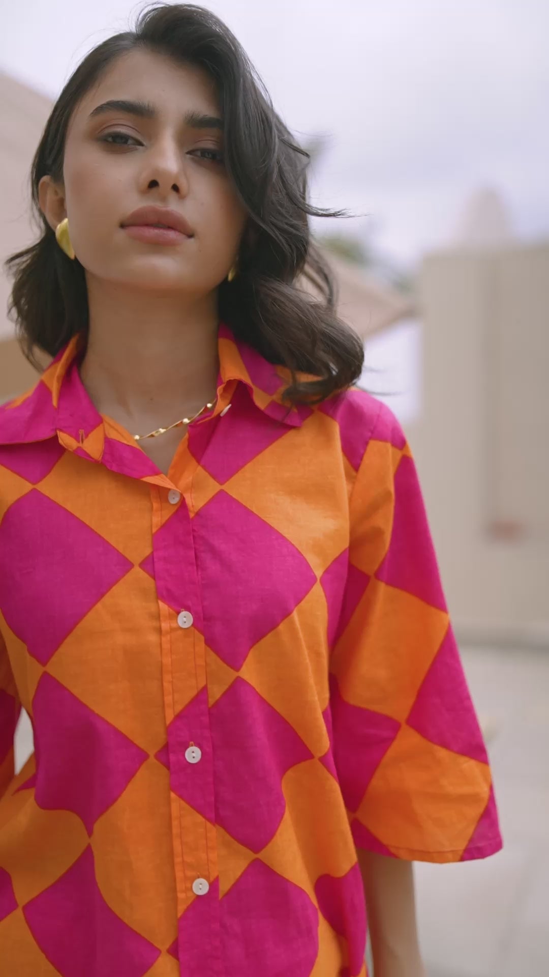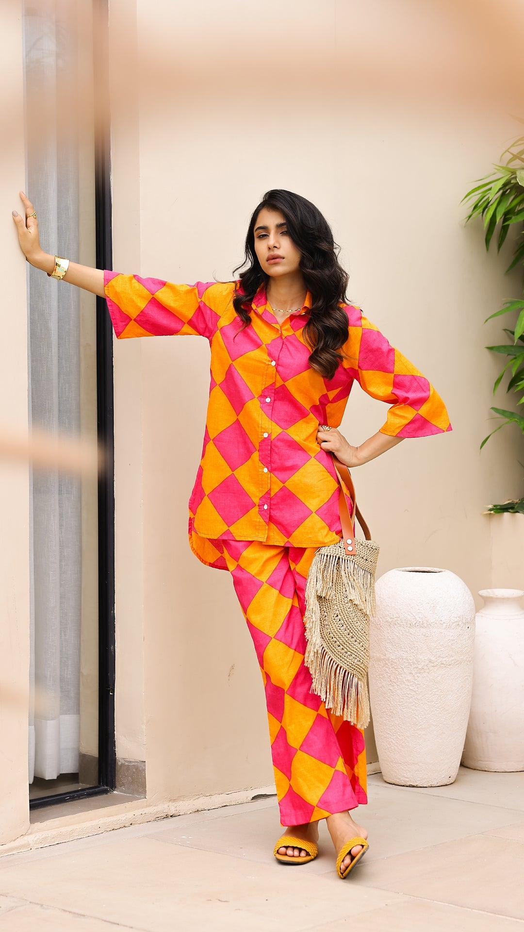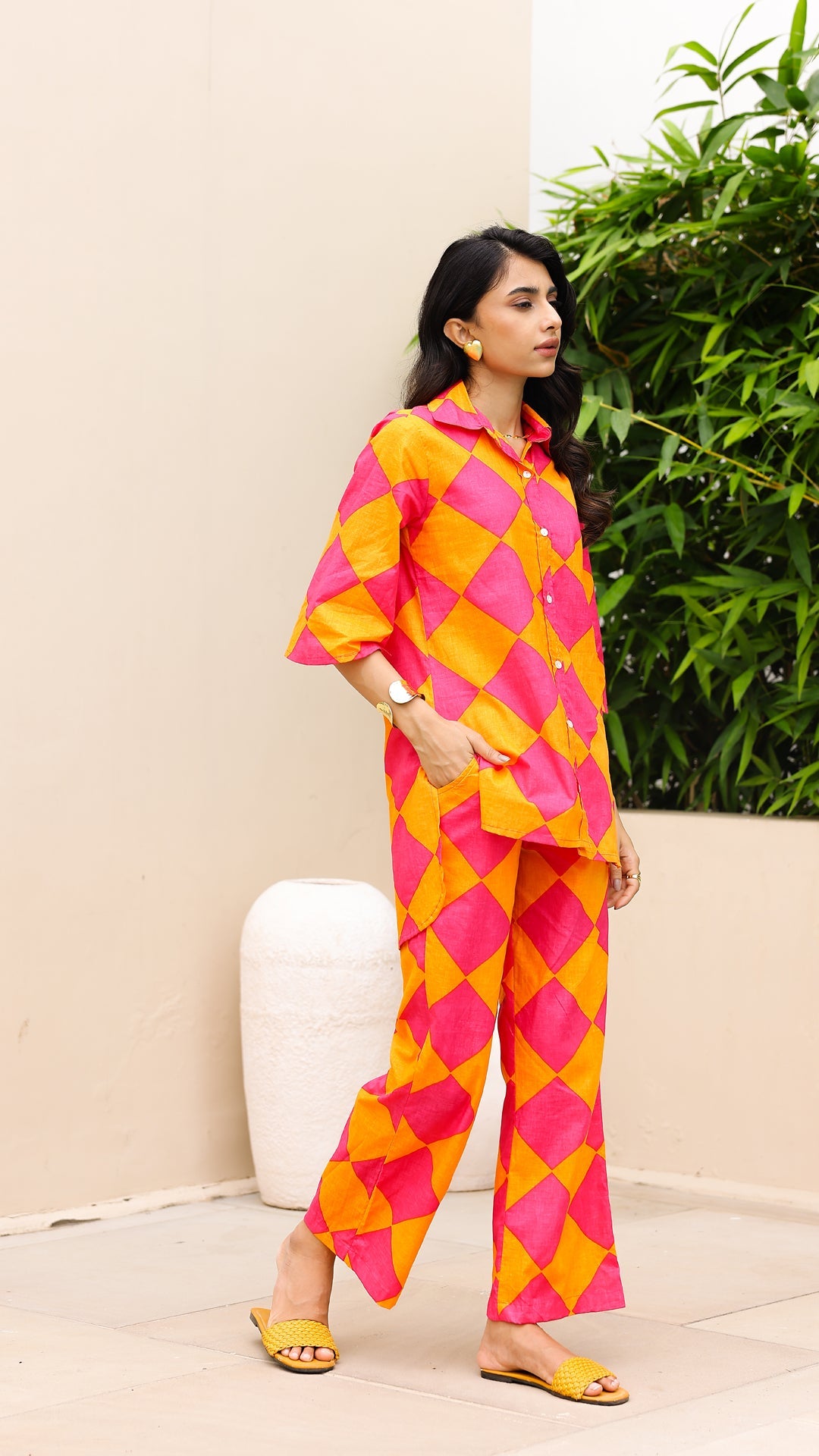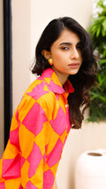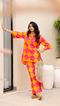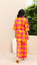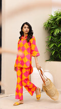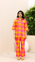 Own the spotlight in this bold pink and orange diamond-print co-ord set. Featuring a breezy button-down shirt and comfy straight-leg pants, this set is made for vibrant days and playful moods. Perfect for vacations, festivals, or standout casual looks.