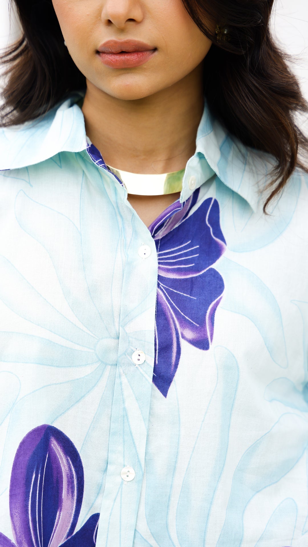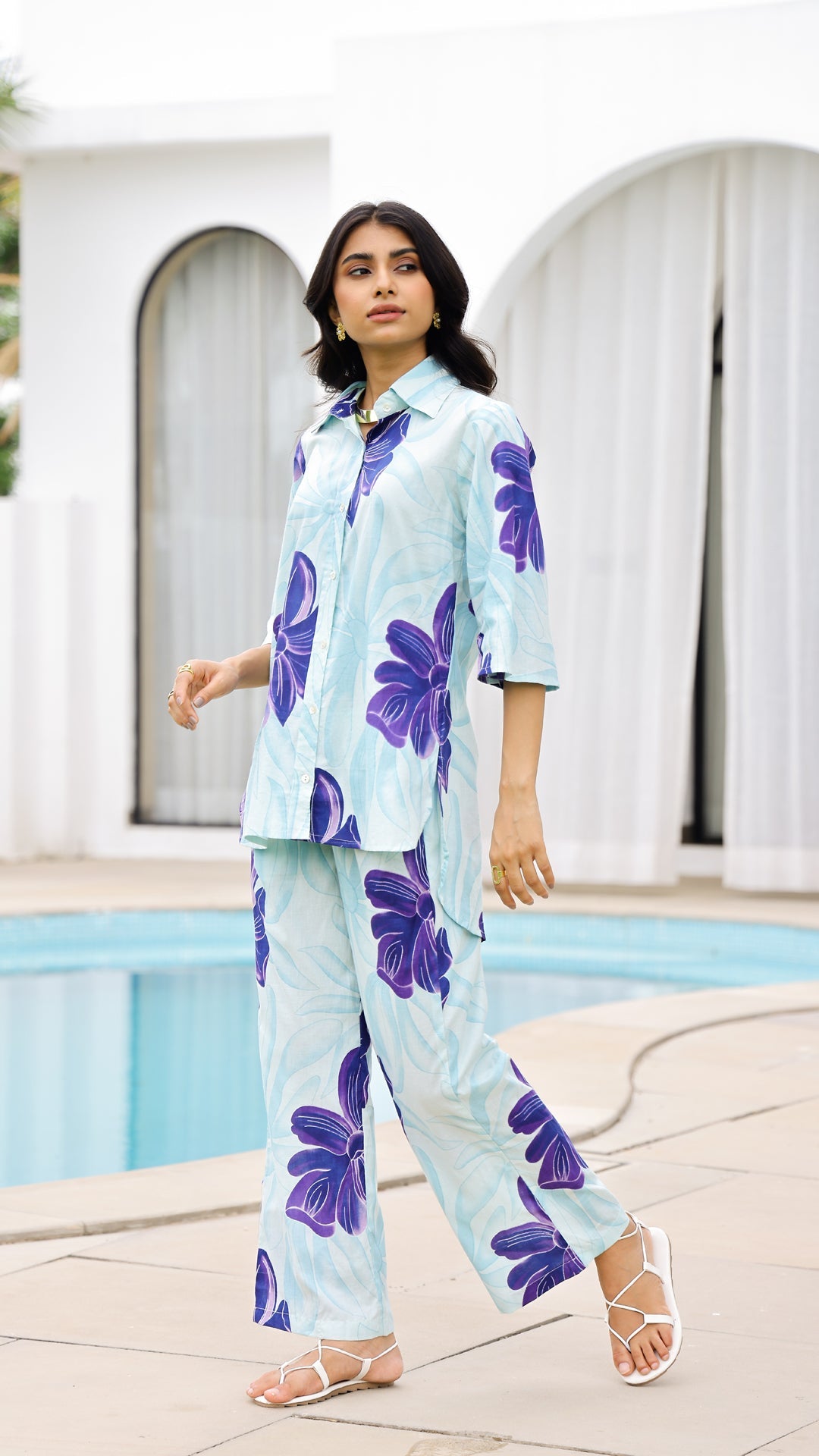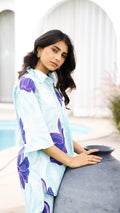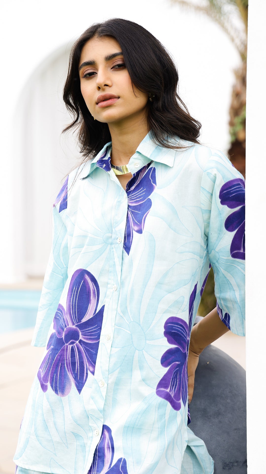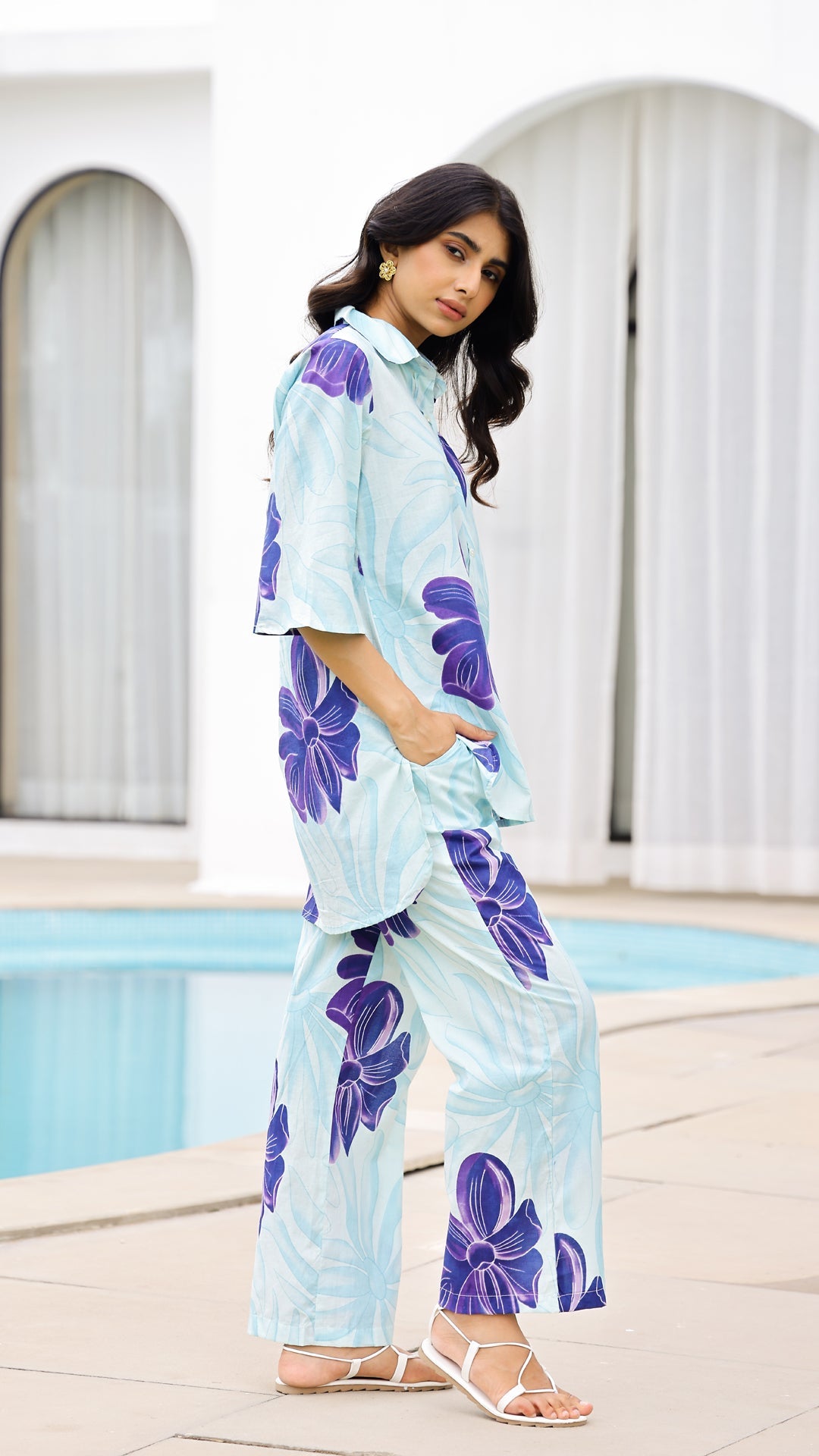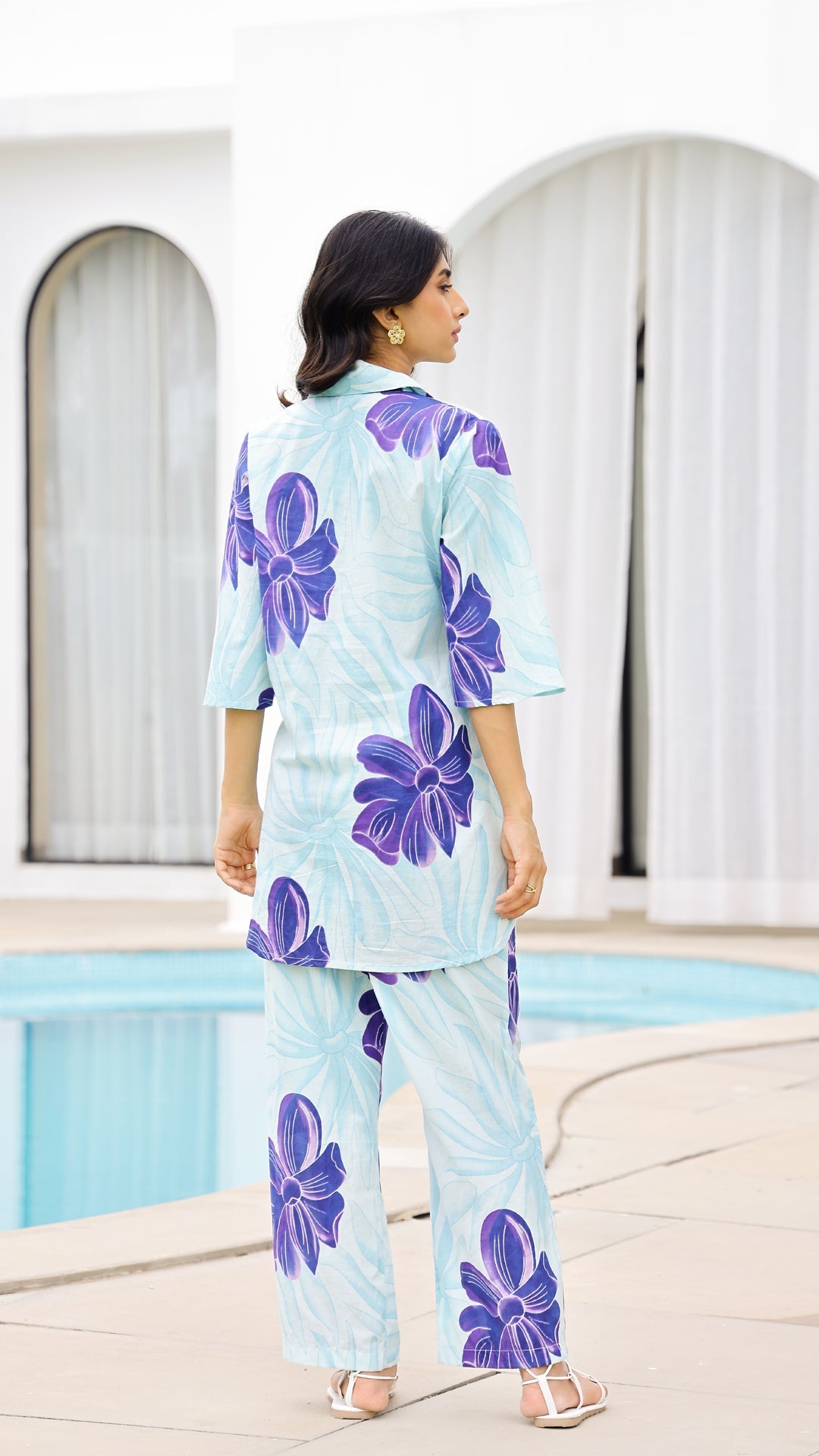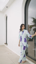 Fresh, fun, and floral – the Mint Bloom Co-ord Set is a summer essential. Designed with a soft mint base and vibrant violet blooms, this cotton set offers breathable comfort and everyday elegance.