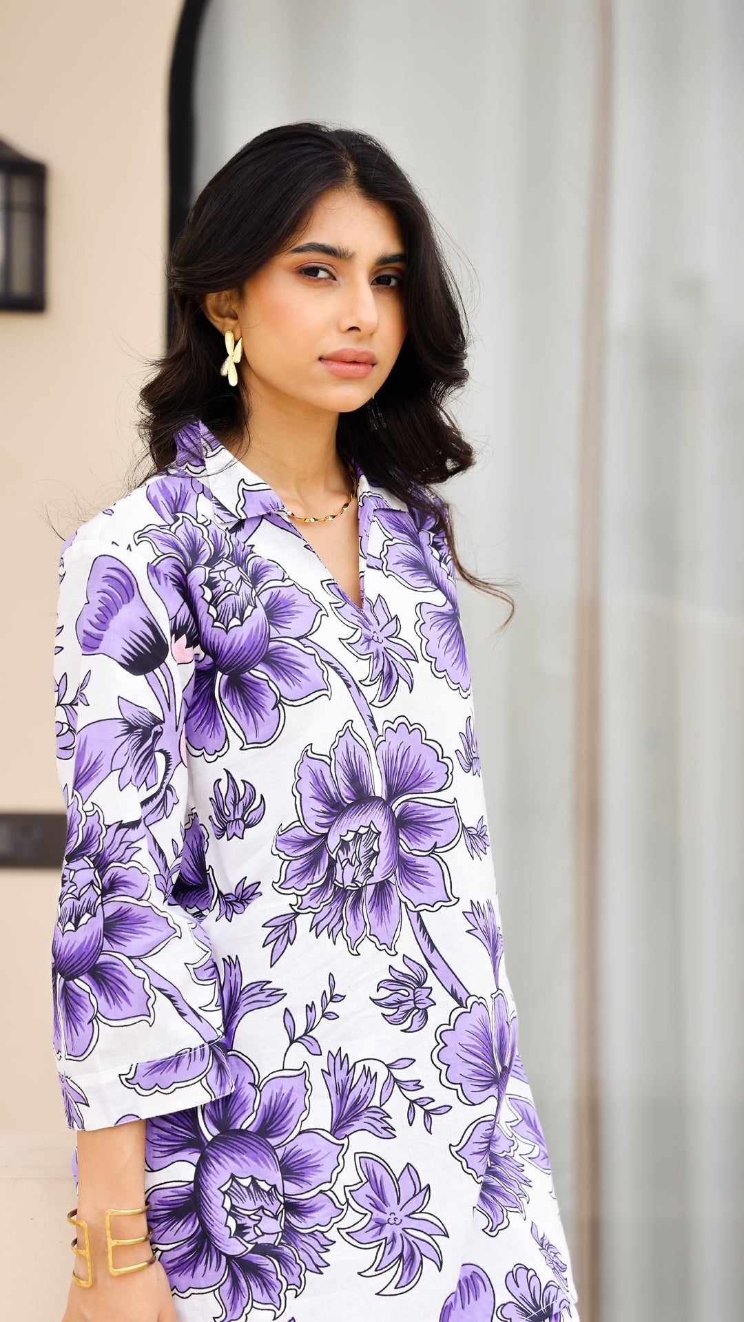 Soft, floral, and effortlessly chic – the Lavender Bloom Co-ord Set is your go-to for everyday elegance. Crafted in breathable cotton with bold violet florals, it's designed for ease and charm.