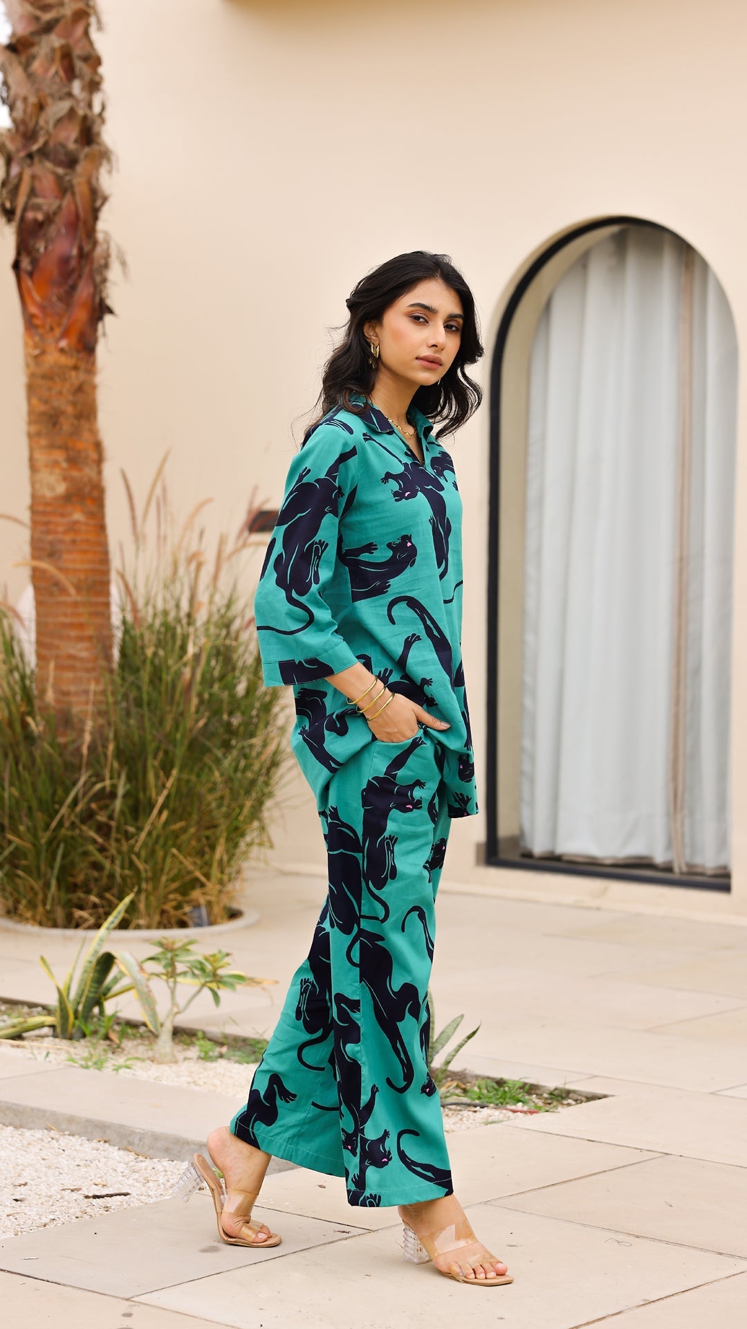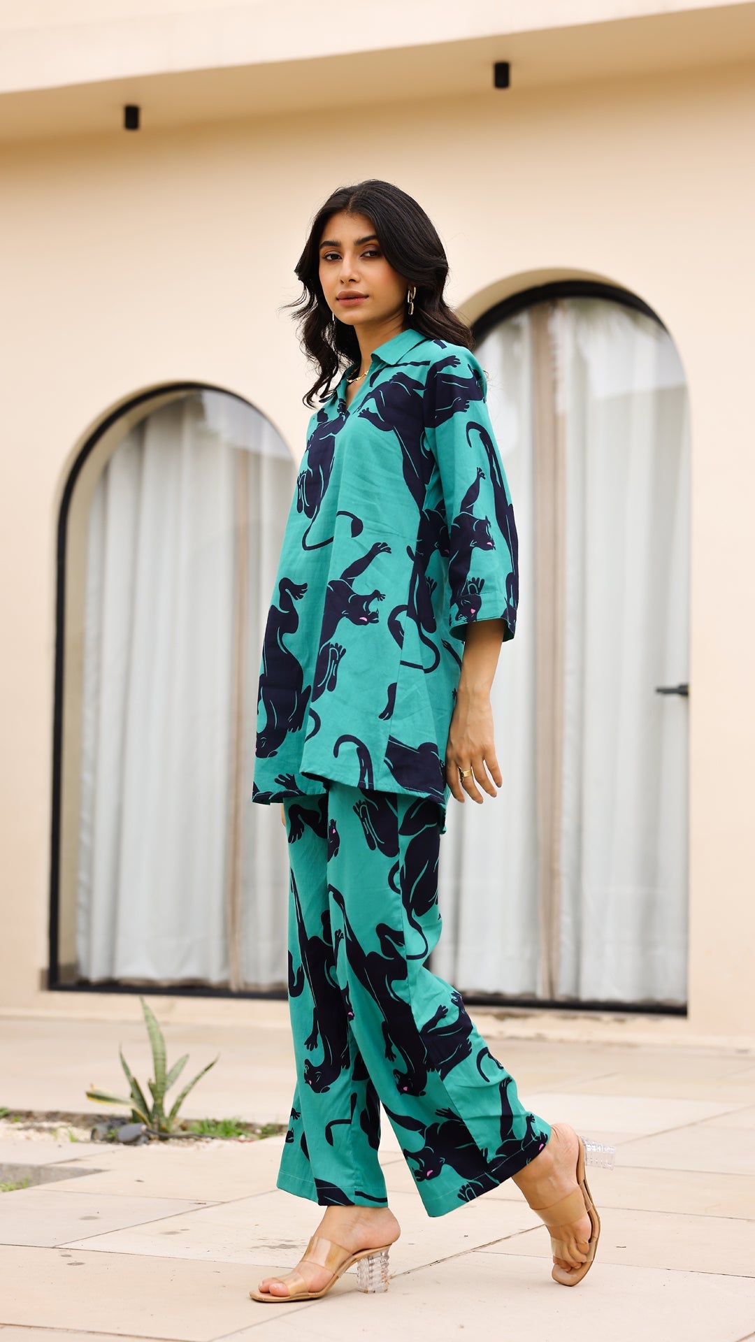 Fierce meets fashion with our emerald green co-ord set featuring bold black panther prints. Crafted in breathable cotton, this relaxed-fit outfit makes a powerful statement while staying effortlessly comfortable.