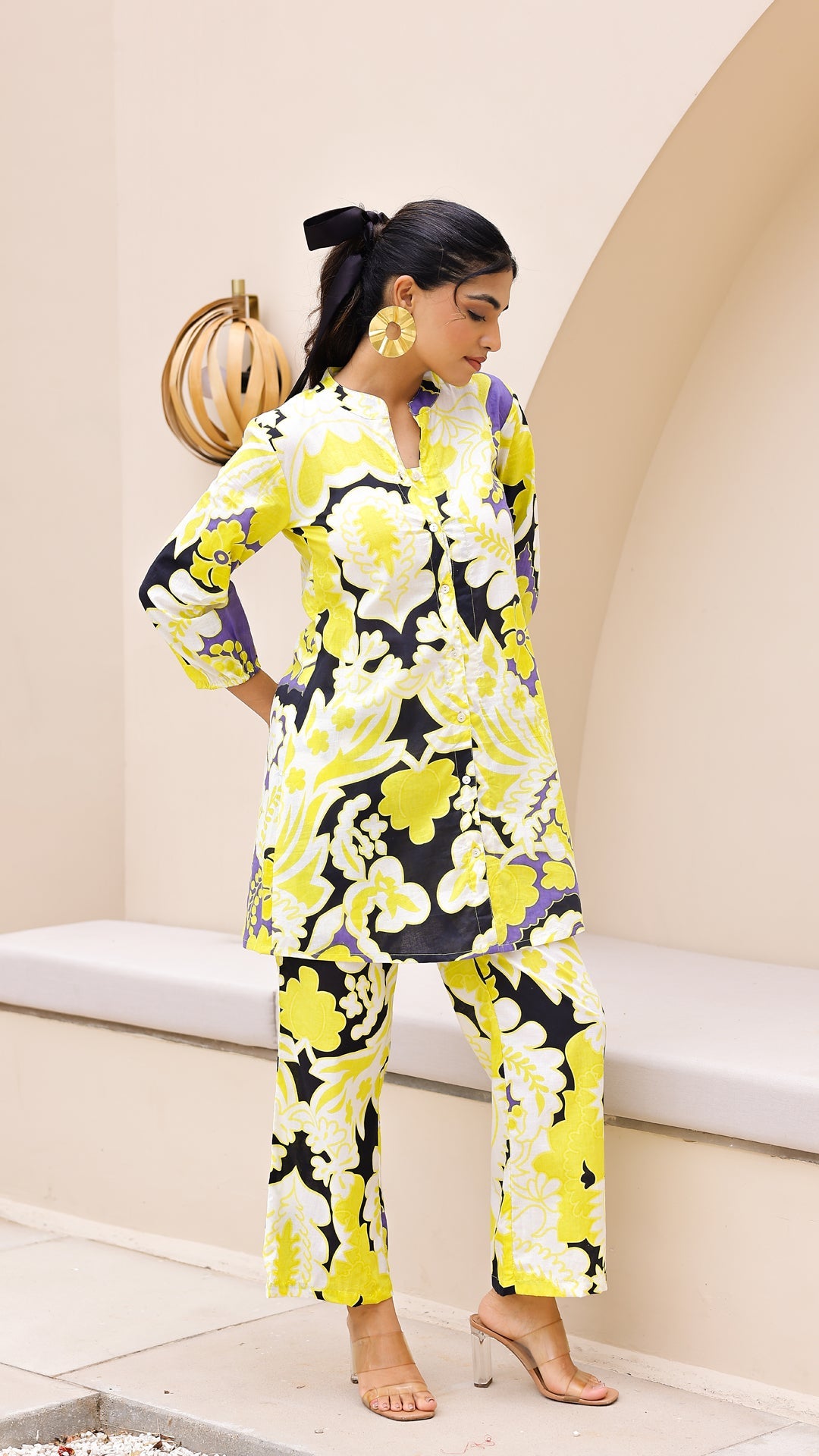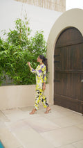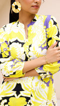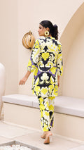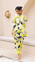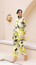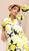 Add a pop of freshness to your wardrobe with this vibrant lime and lilac co-ord set. Designed in a bold floral pattern on a black base, this cotton-linen ensemble features a button-down kurta with soft sleeves and matching wide-leg pants. It's your go-to for a summer statement look.