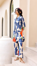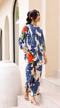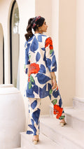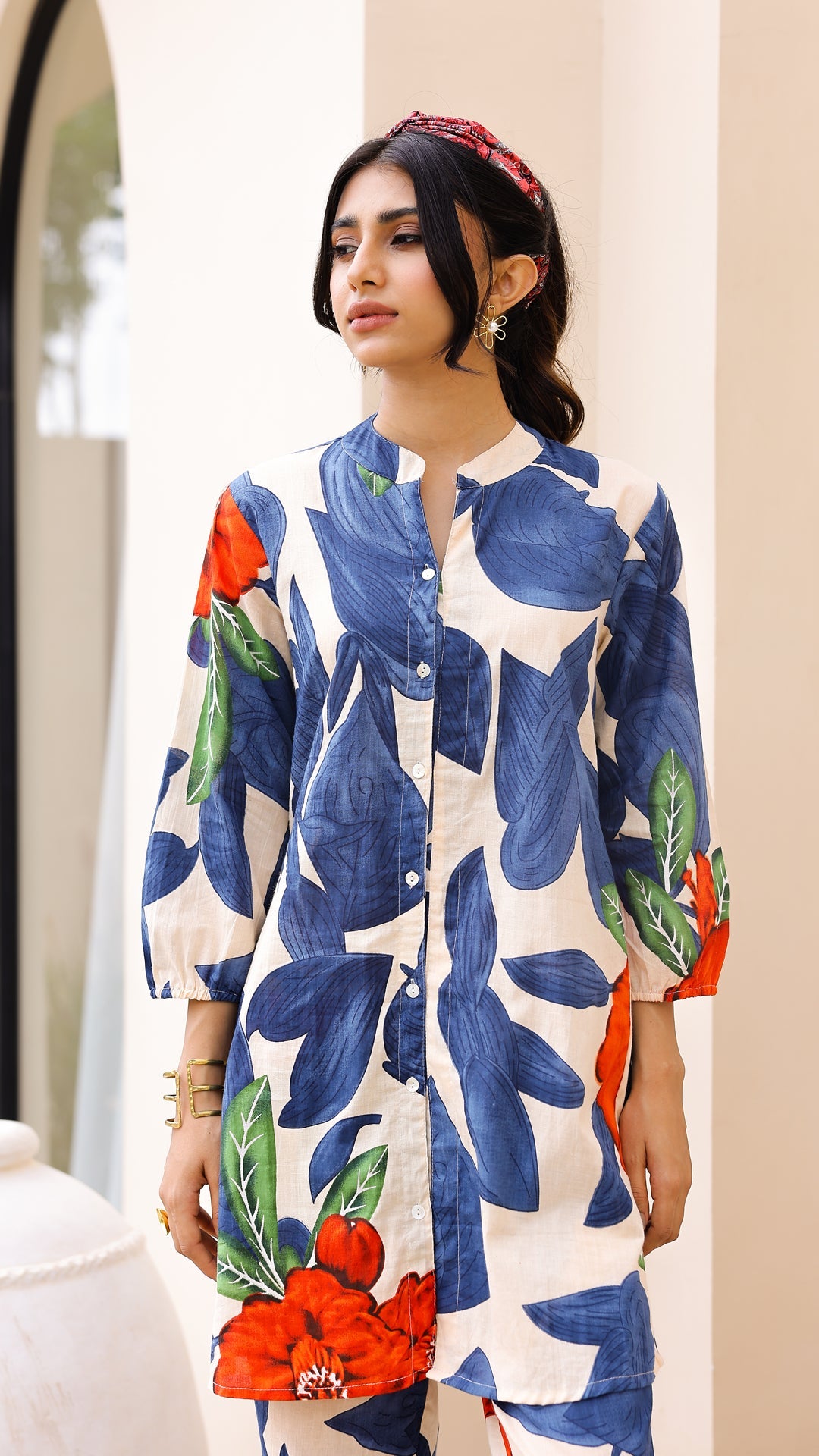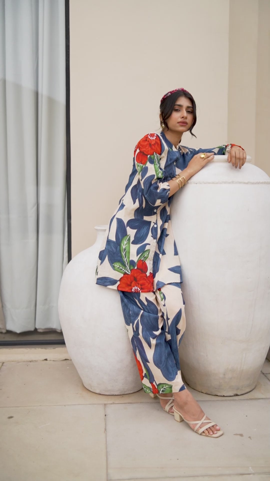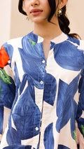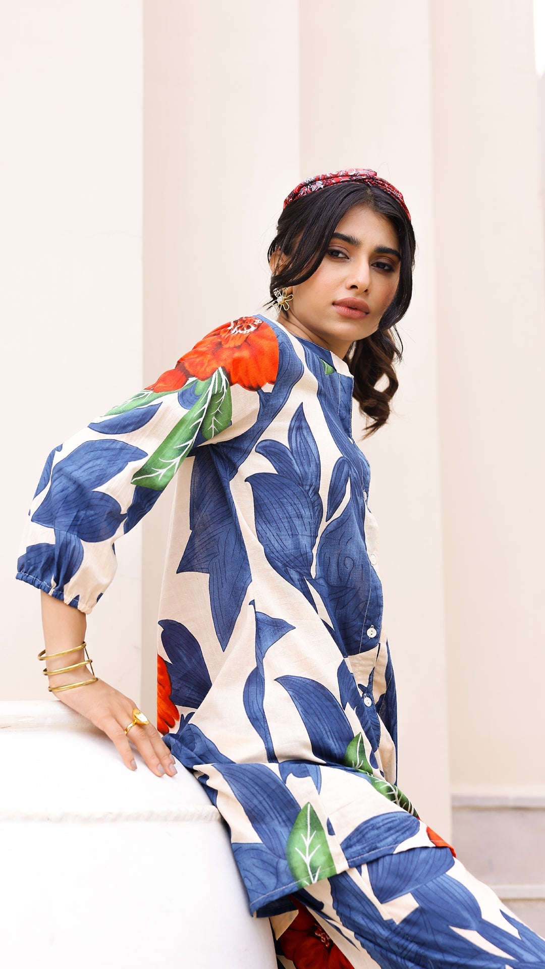 Turn heads with this ivory co-ord set featuring bold blue leaf prints and vibrant red floral accents. Designed in breathable cotton-linen, the kurta features a mandarin collar and button-down front with balloon sleeves, paired with matching straight-fit pants. Perfect for summer brunches or vacation wear.