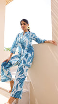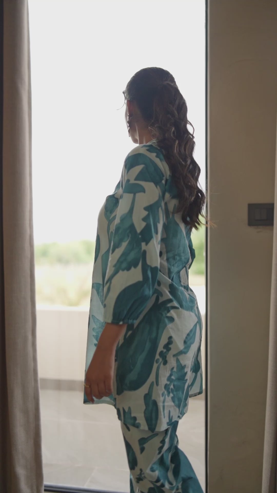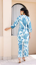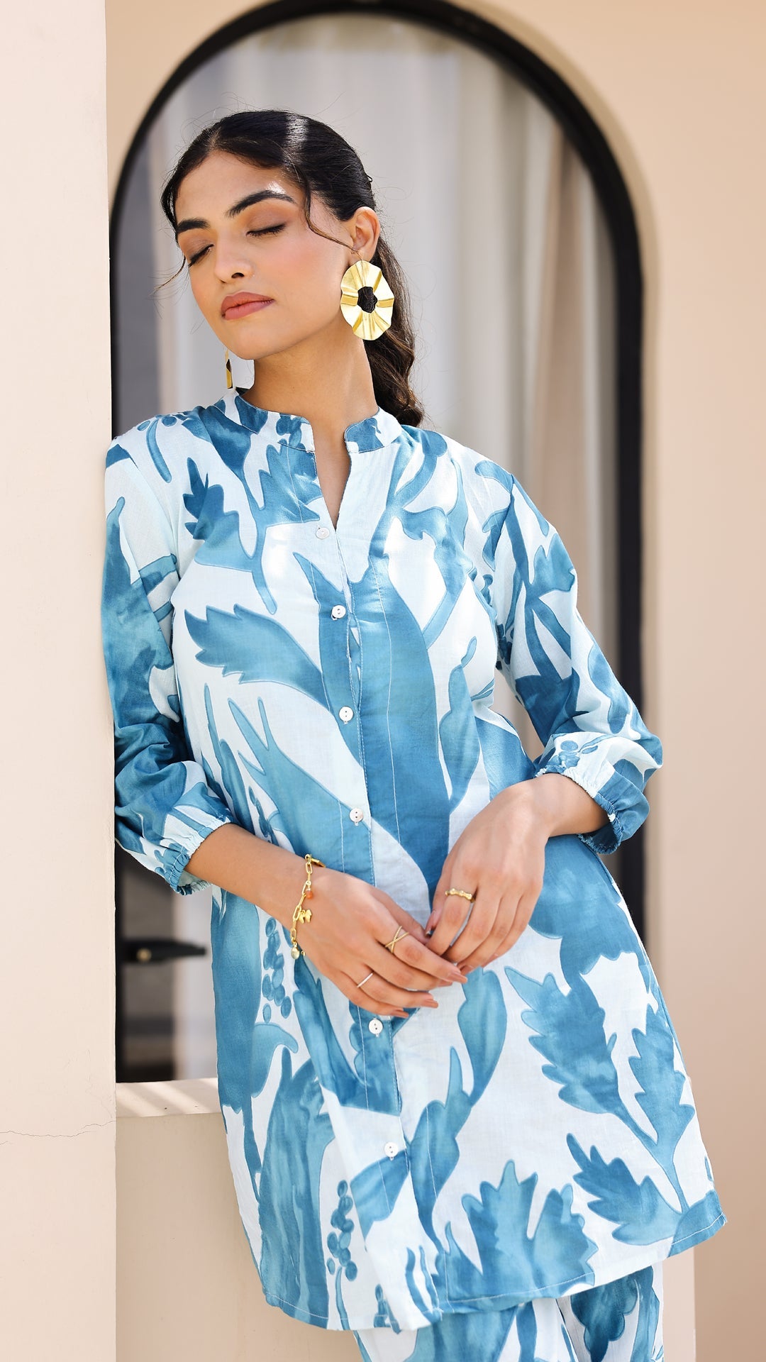 Soothing tones meet bold design in this sky blue co-ord set featuring oversized leaf motifs. Crafted from breathable cotton-linen, this button-down kurta with 3/4 sleeves pairs effortlessly with relaxed-fit pants—ideal for summer days, vacations, or casual brunch looks.