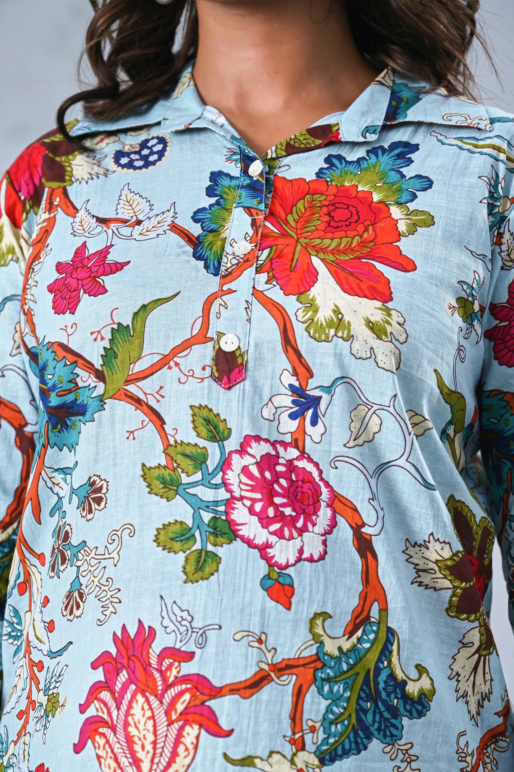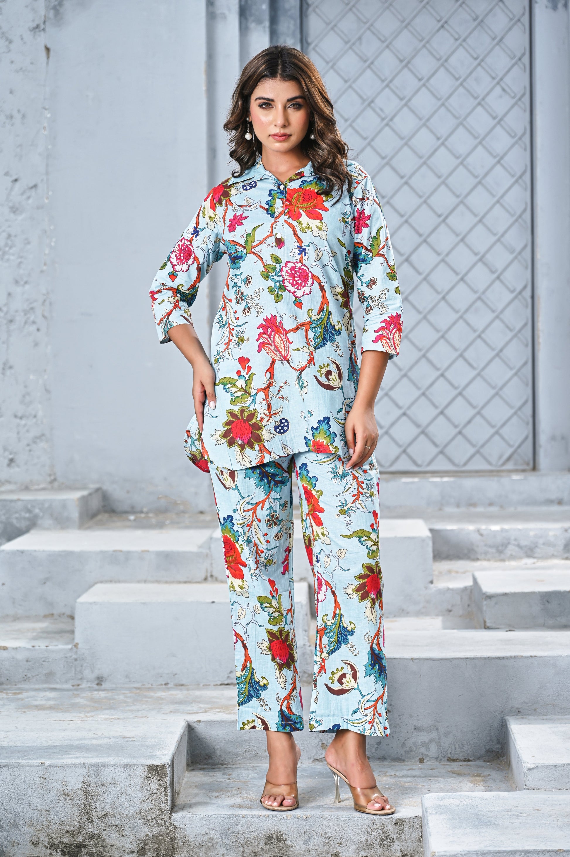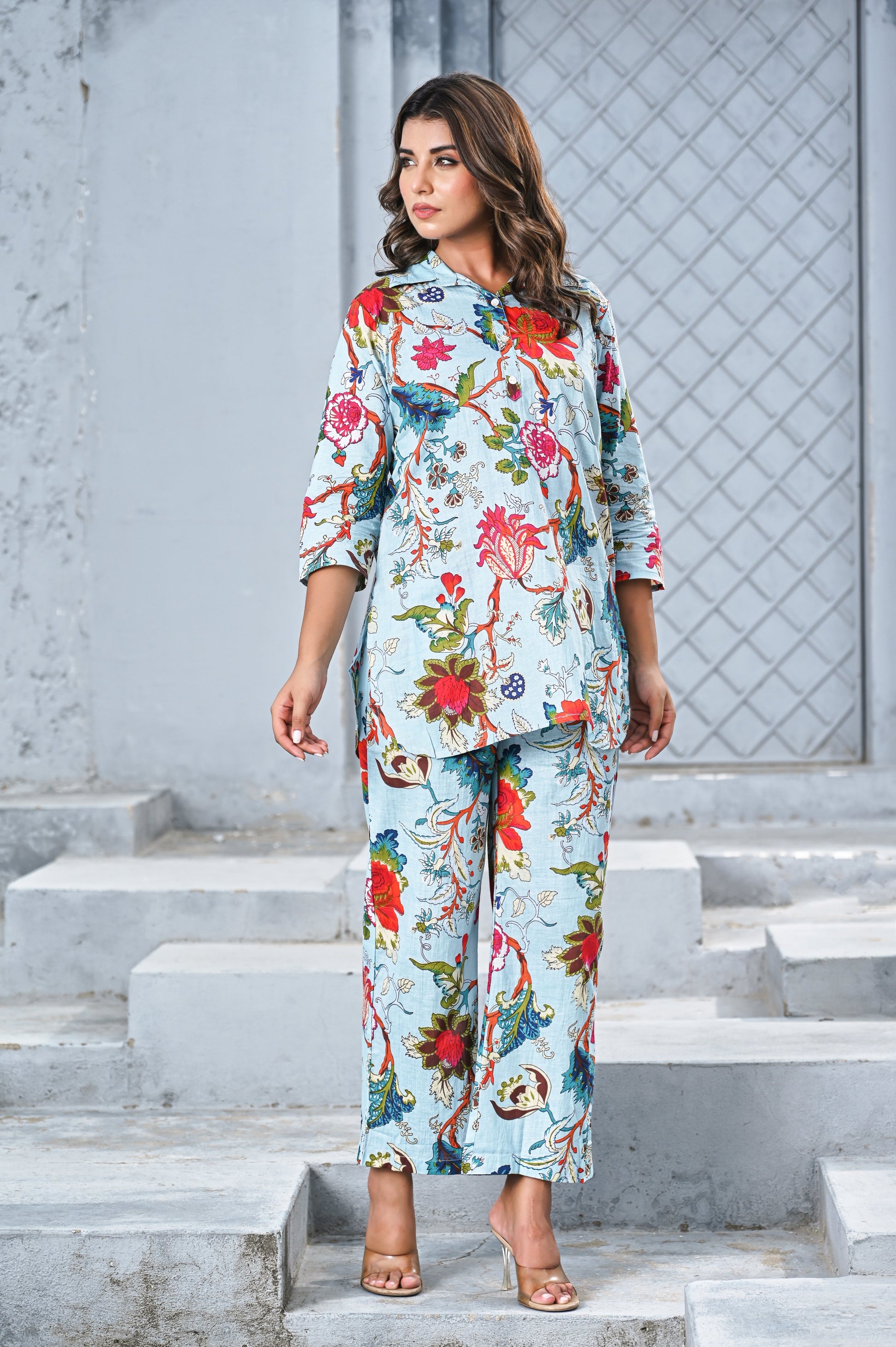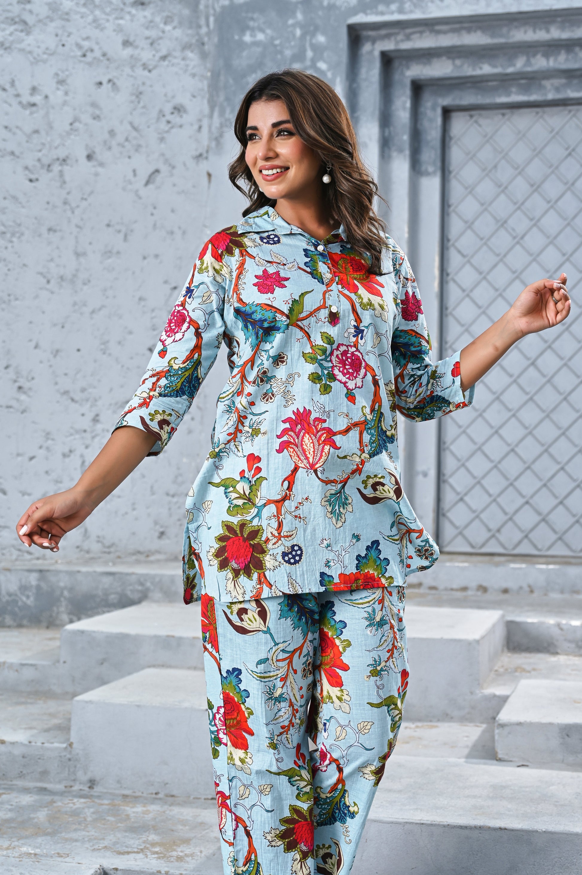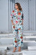 Add a touch of elegance to your casual wardrobe with this sky blue co-ord set featuring a vibrant floral print. The relaxed shirt with a half-button front and 3/4 sleeves pairs beautifully with straight-leg pants, offering both comfort and style. Perfect for brunch, travel, or chic everyday wear.
