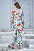 Women’s Sky Blue Floral Print Co-ord Set – Elegant Shirt & Straight Pants