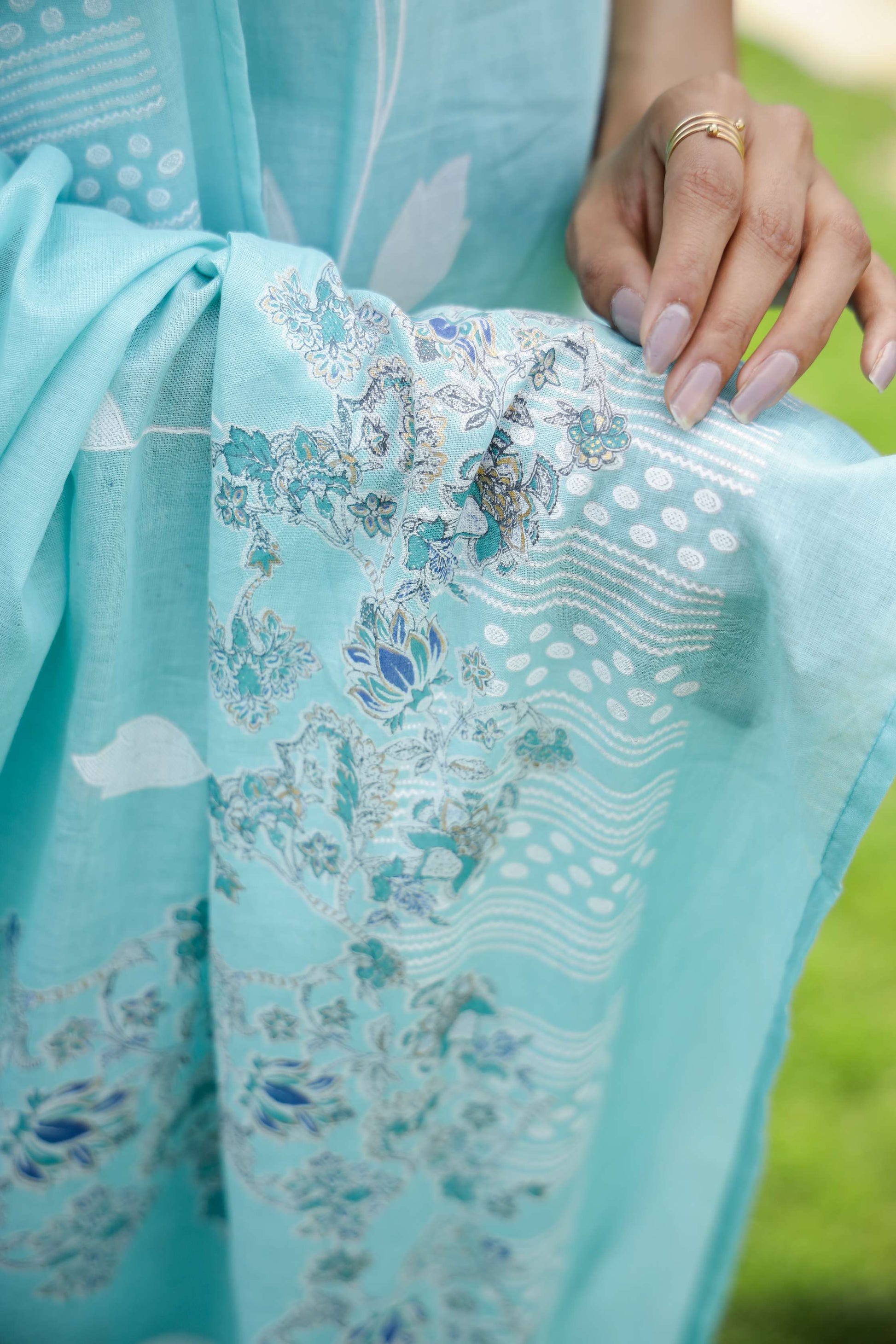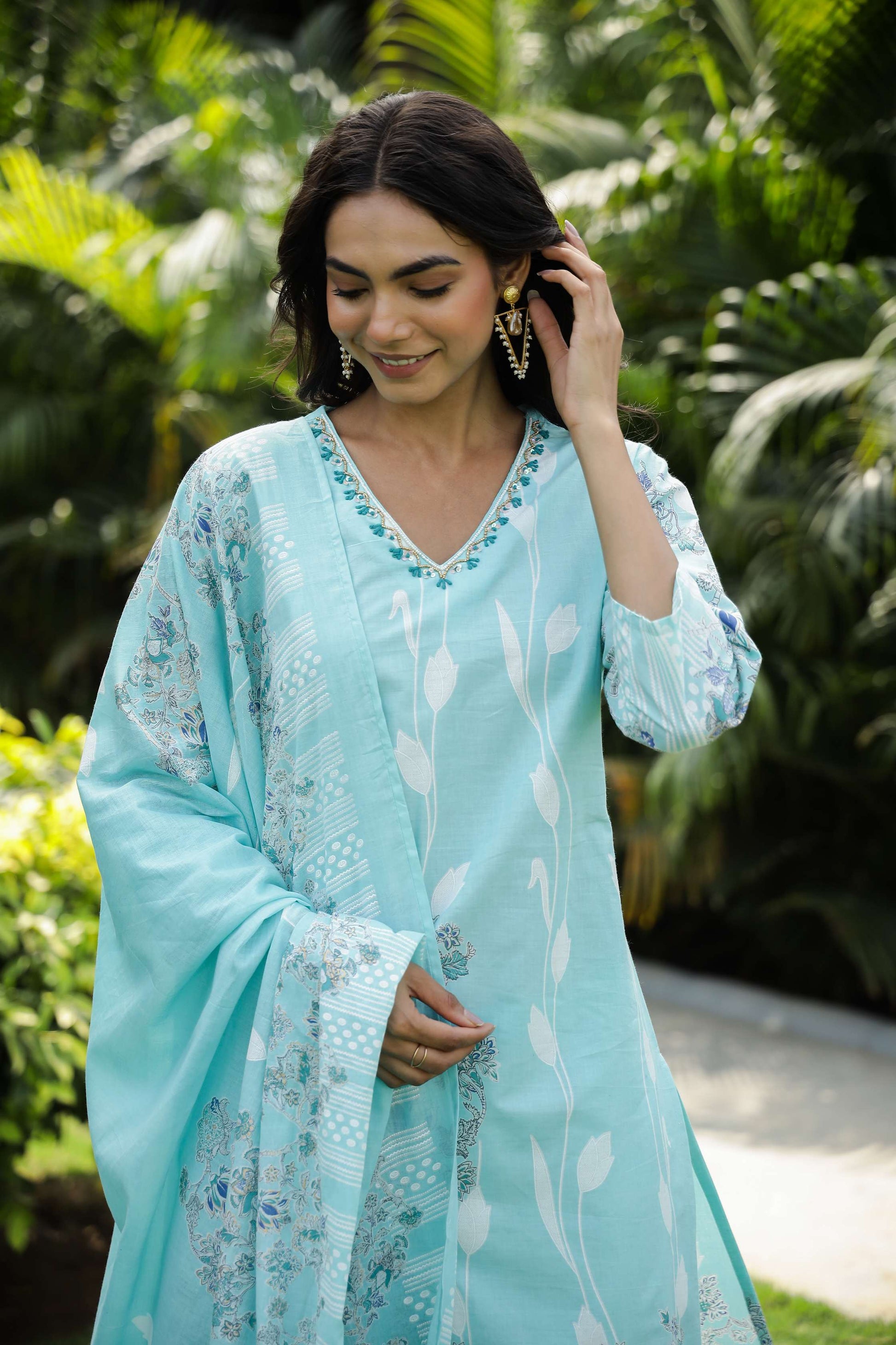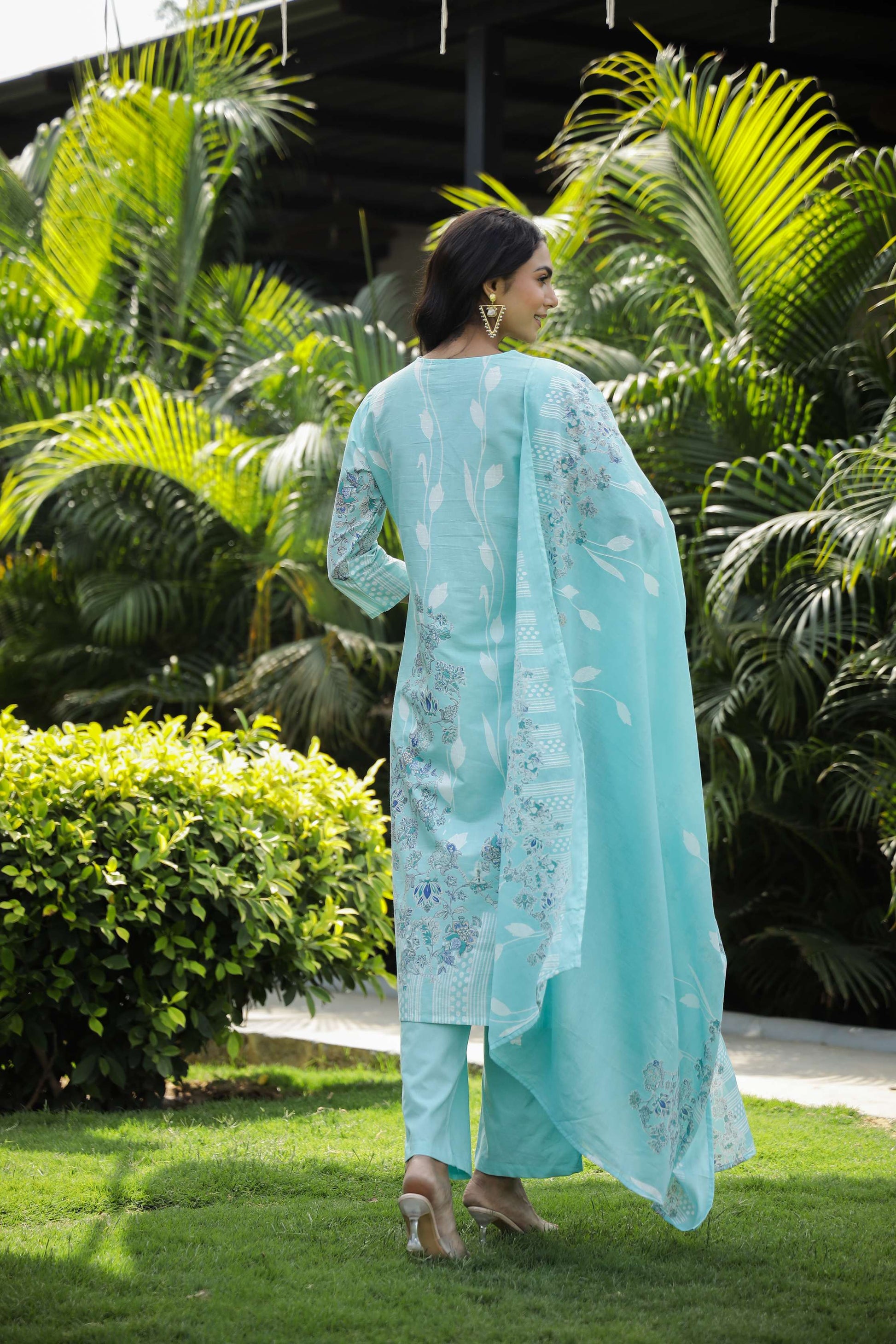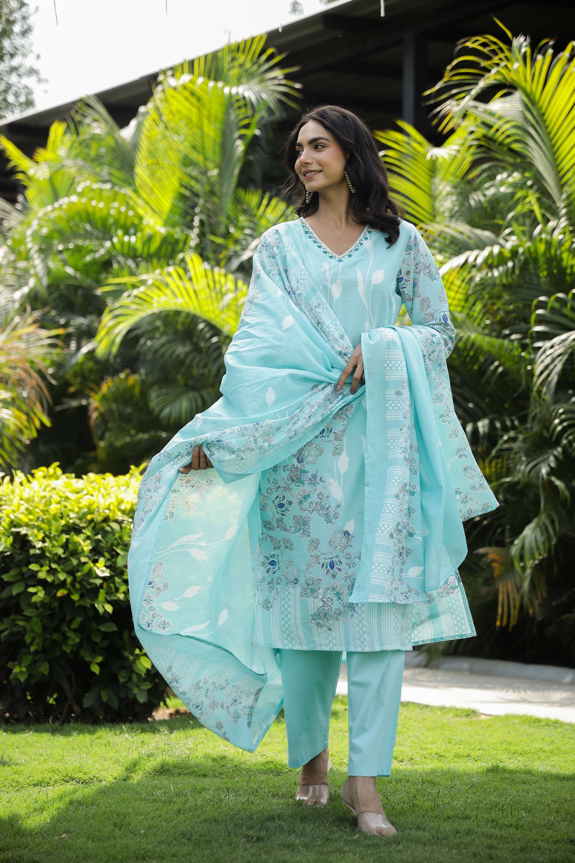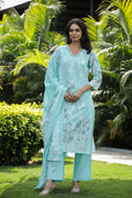 Serene Aqua Blue Floral Print Cotton Kurta Set with Dupatta Export to Sheets