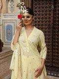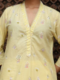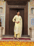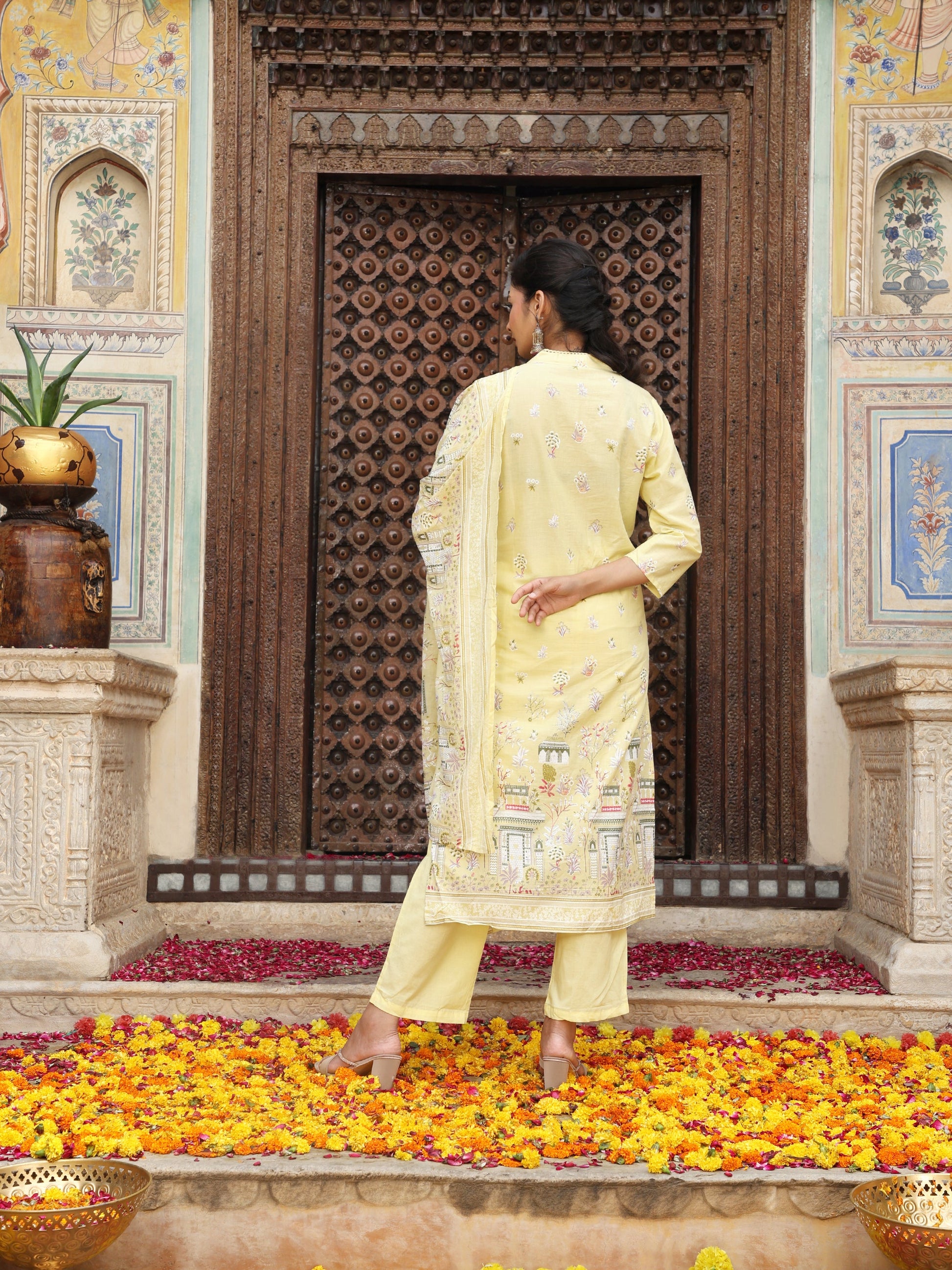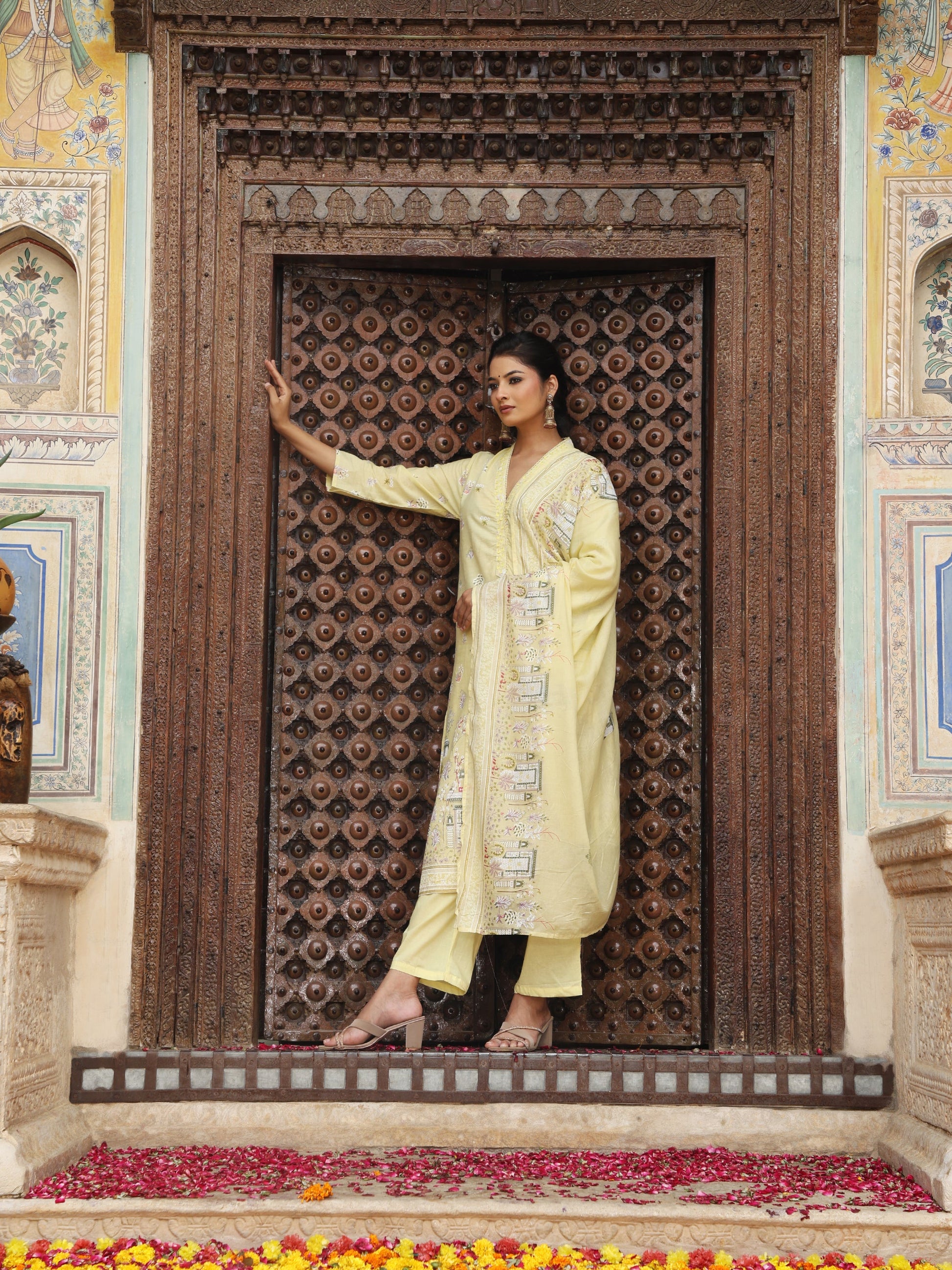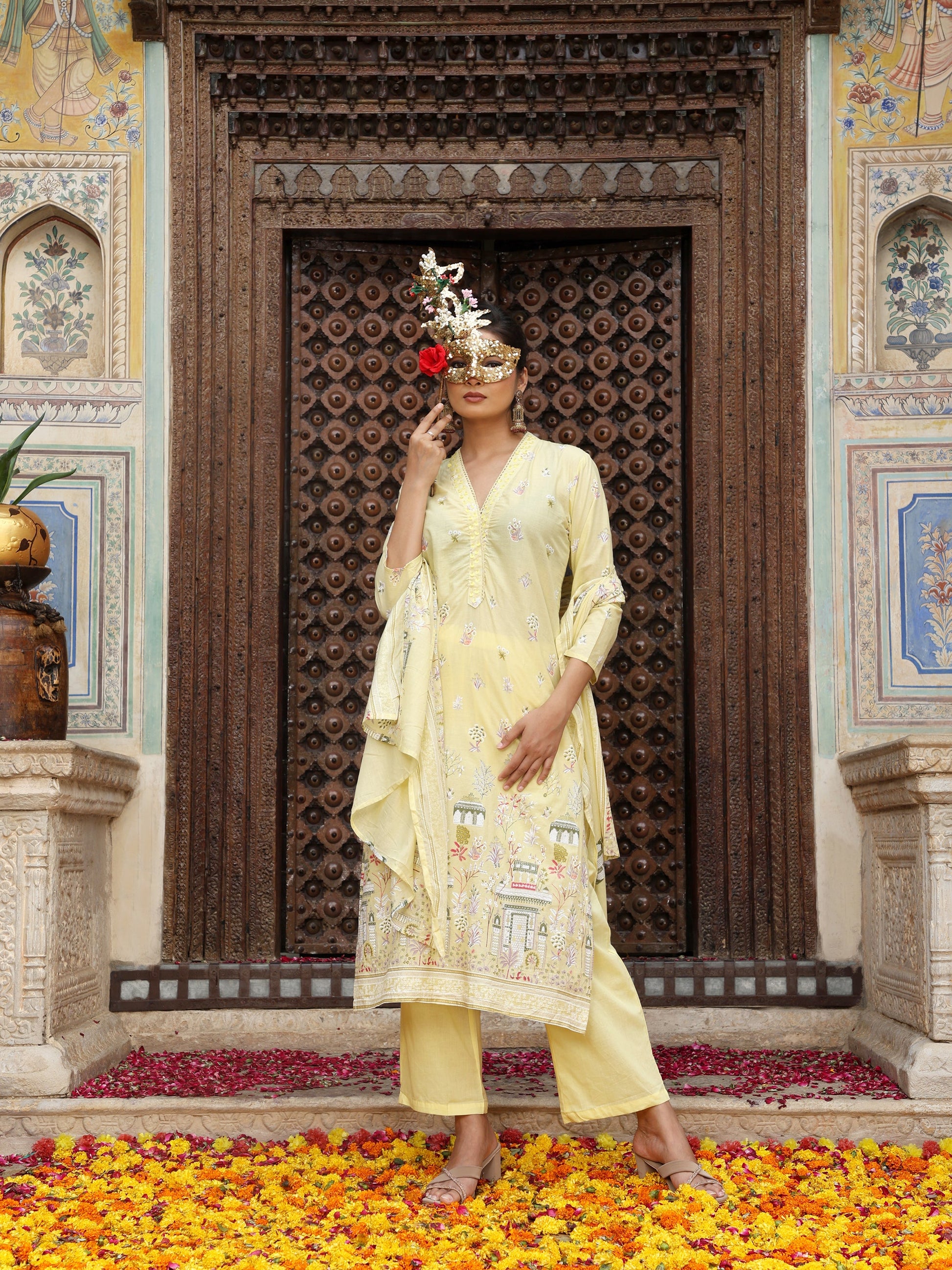 Lemon Yellow Heritage Print Cotton Suit Set with Dupatta