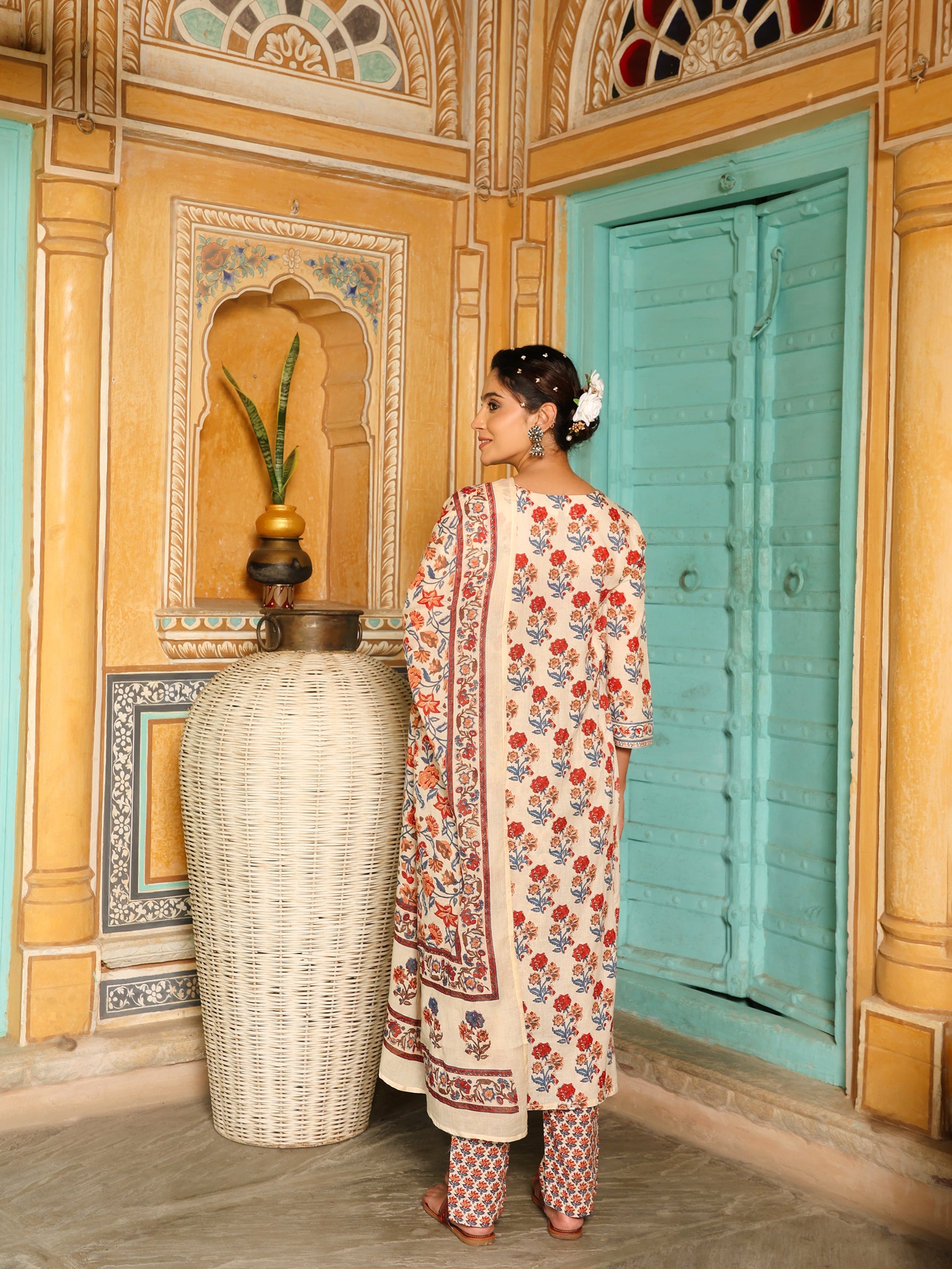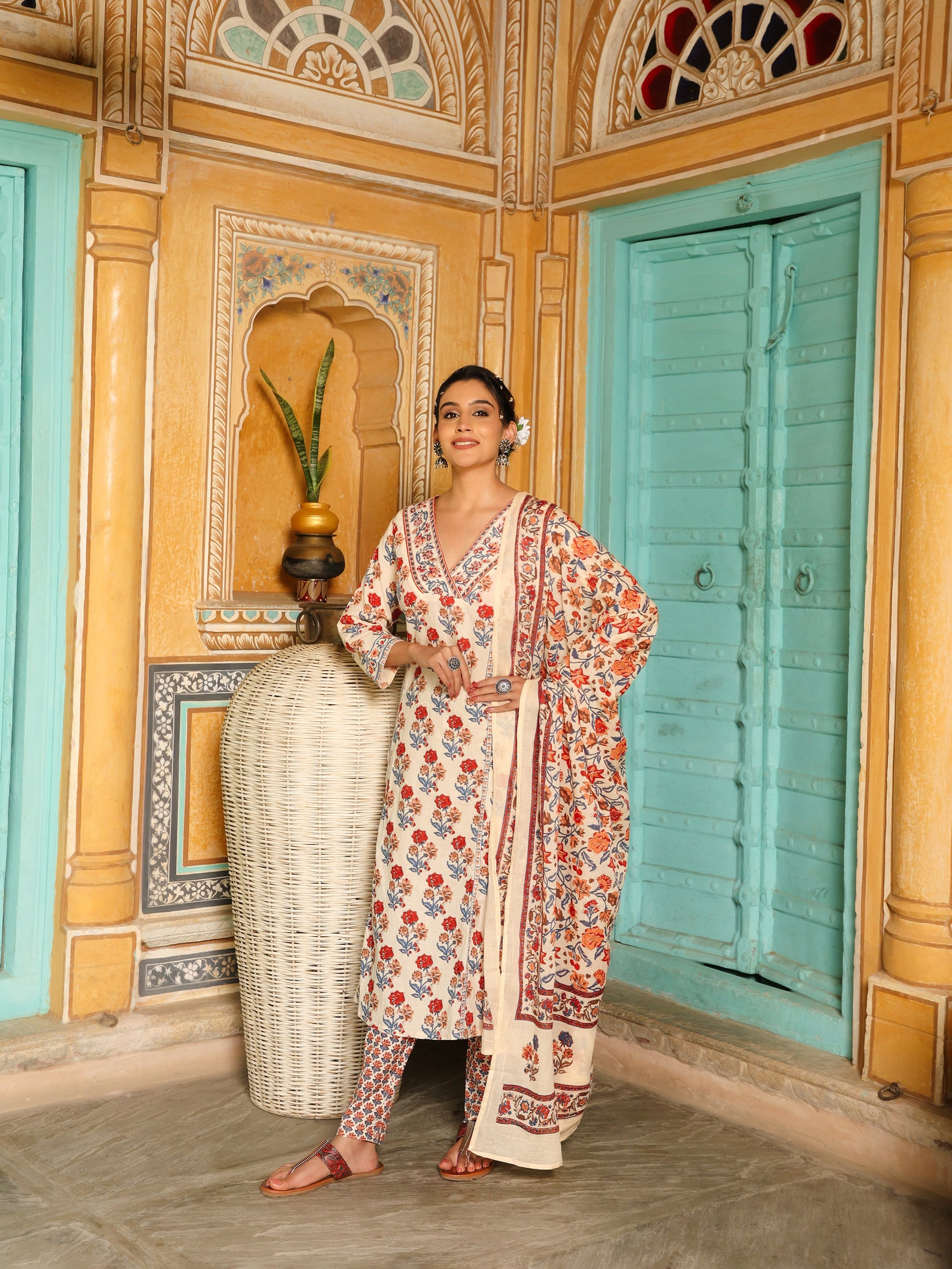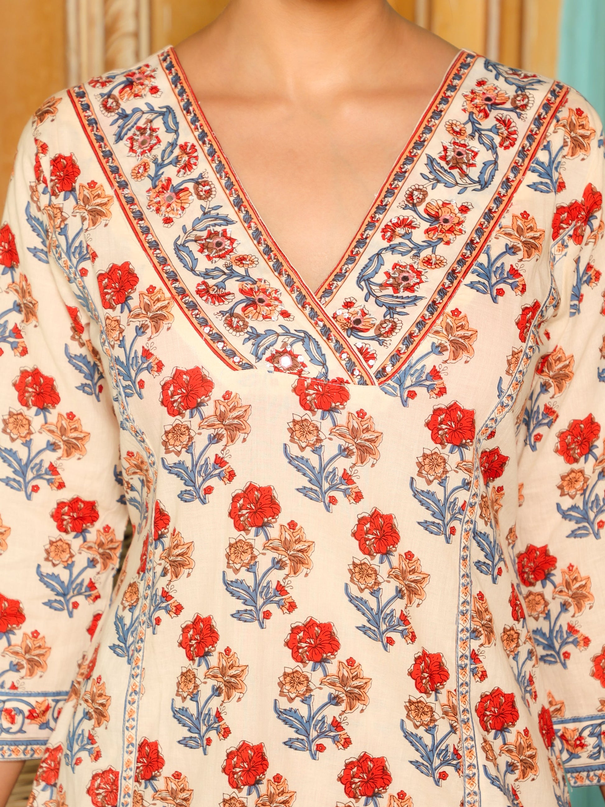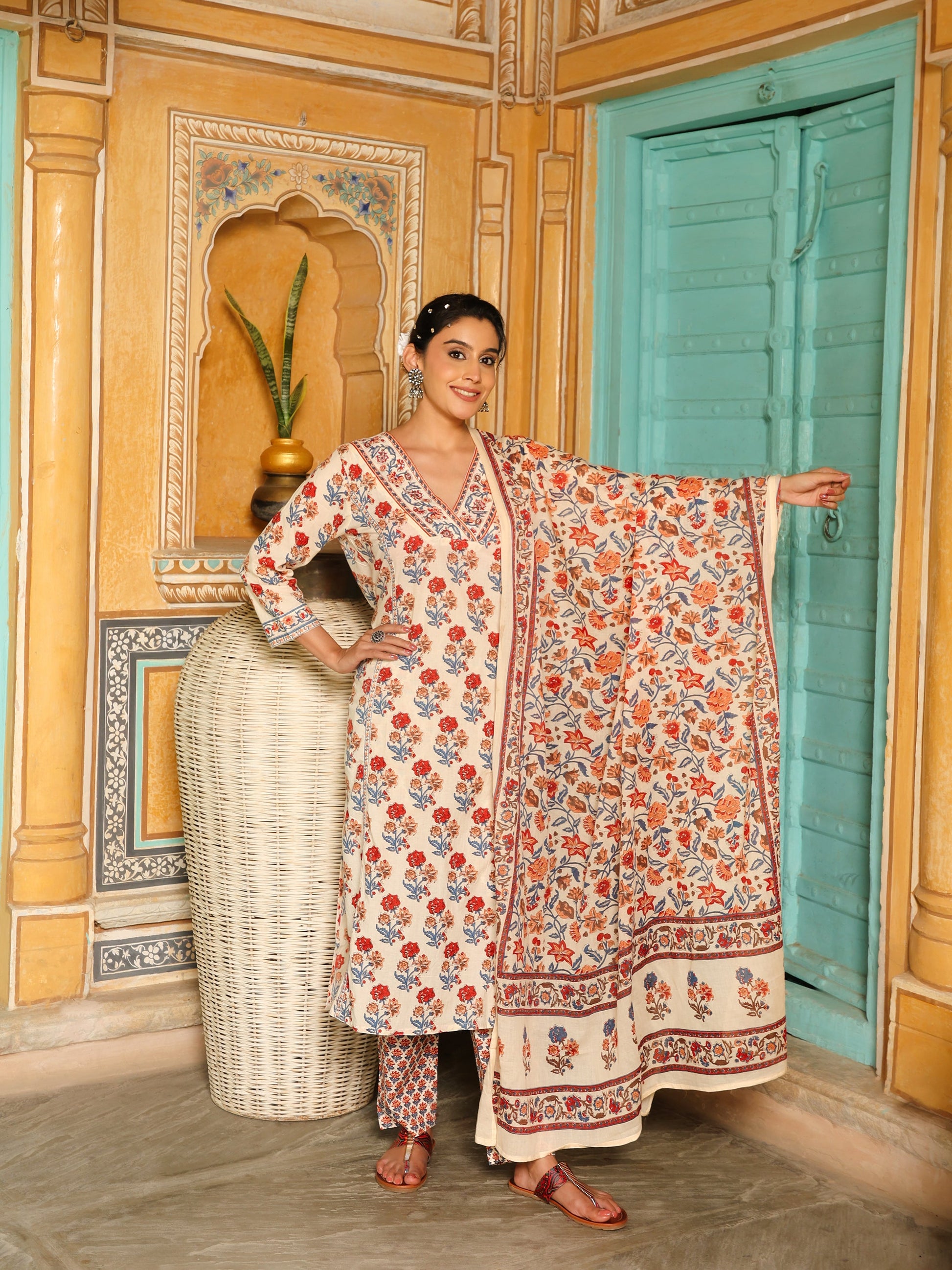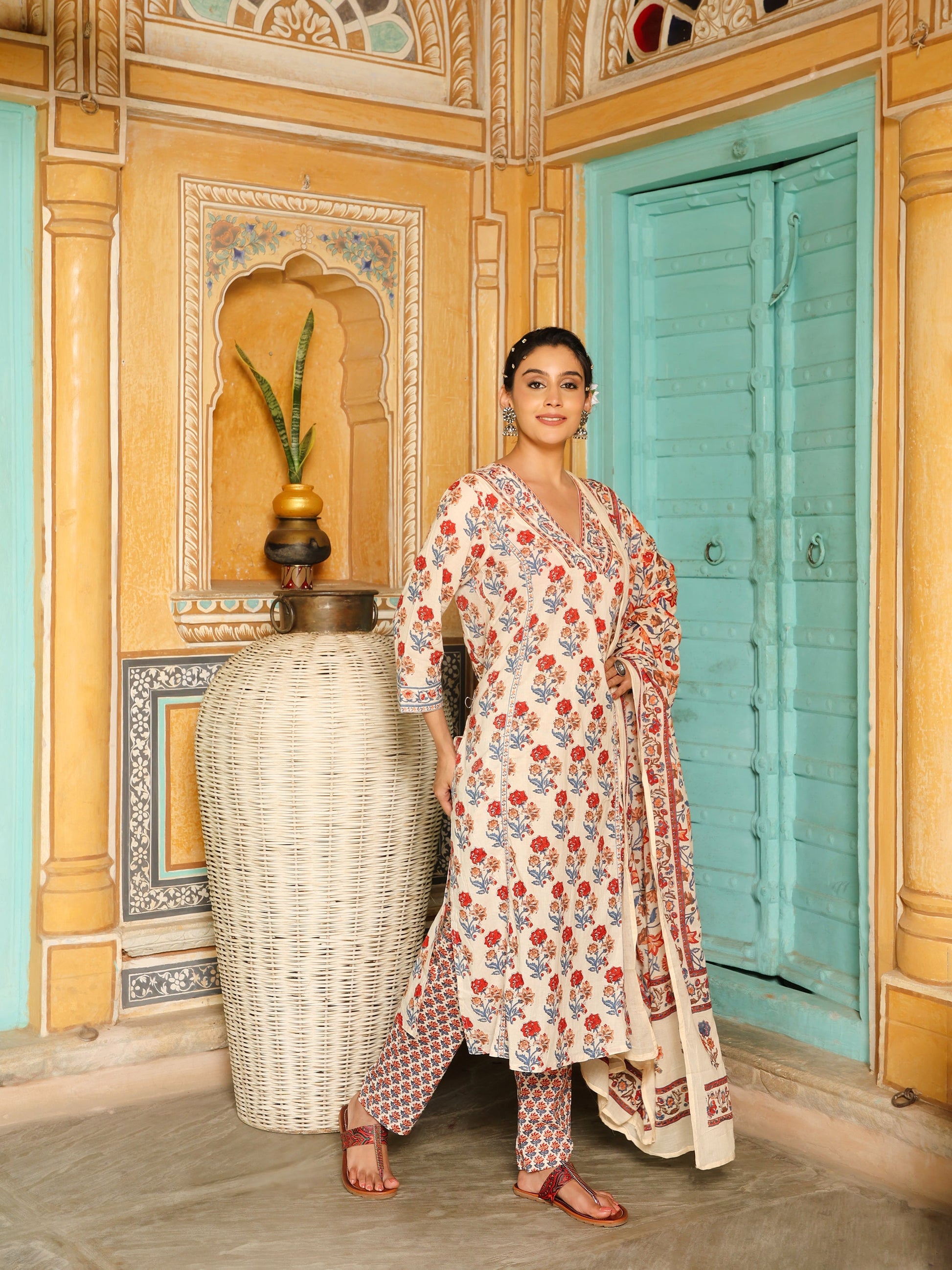 Embrace the beauty of traditional Indian craftsmanship with our Classic Floral Block Print Cotton Suit Set. This beautiful three-piece set features an off-white cotton kurta and coordinating palazzo-style trousers, both richly detailed with vibrant red and blue floral block prints. The accompanying dupatta complements the prints beautifully, making this ensemble a versatile and stylish choice for any daytime event or casual gathering.