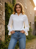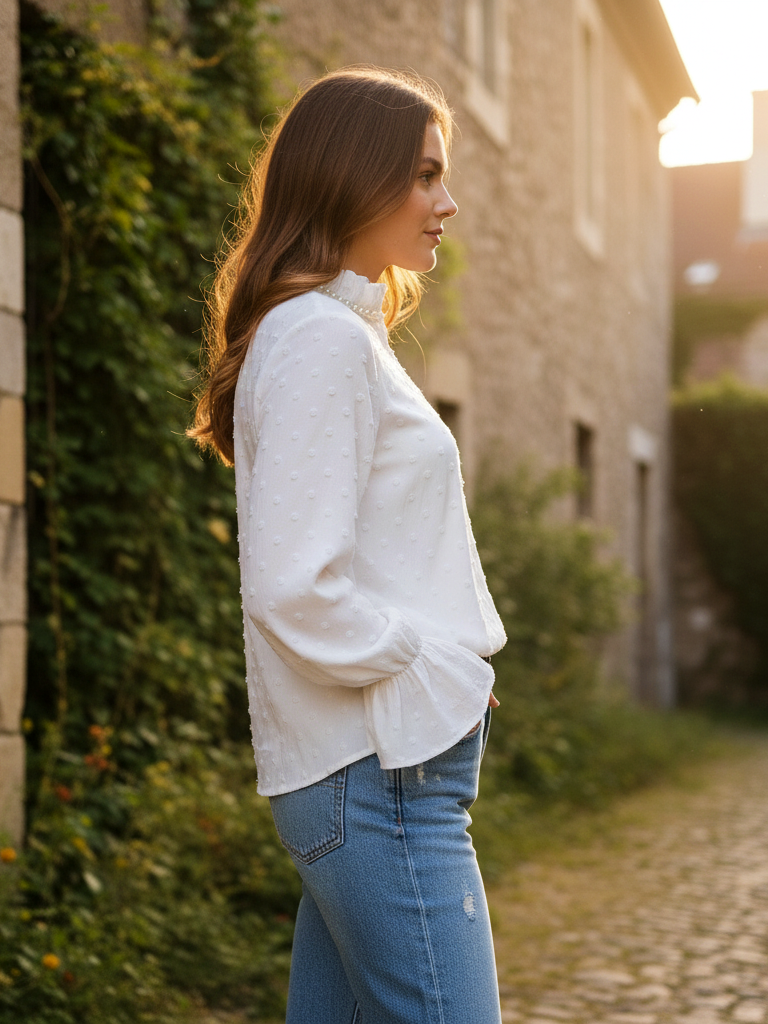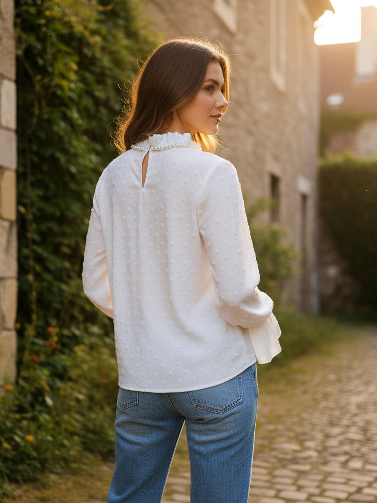 White Swiss Dot Chiffon Blouse with Pearl Collar Top