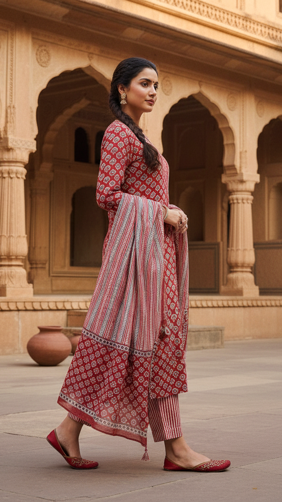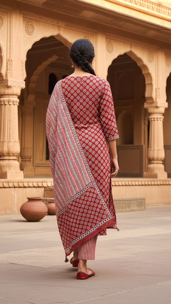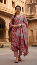 Rustic Maroon Printed V-Neck Kurta with Striped Trousers and Matching Block Print Dupatta