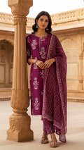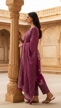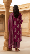 Majestic Wine Purple Silver Foil Print Kurta Set with Intricate Geometric Print Dupatta