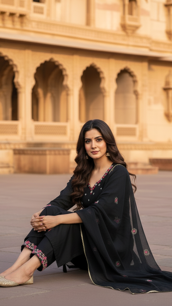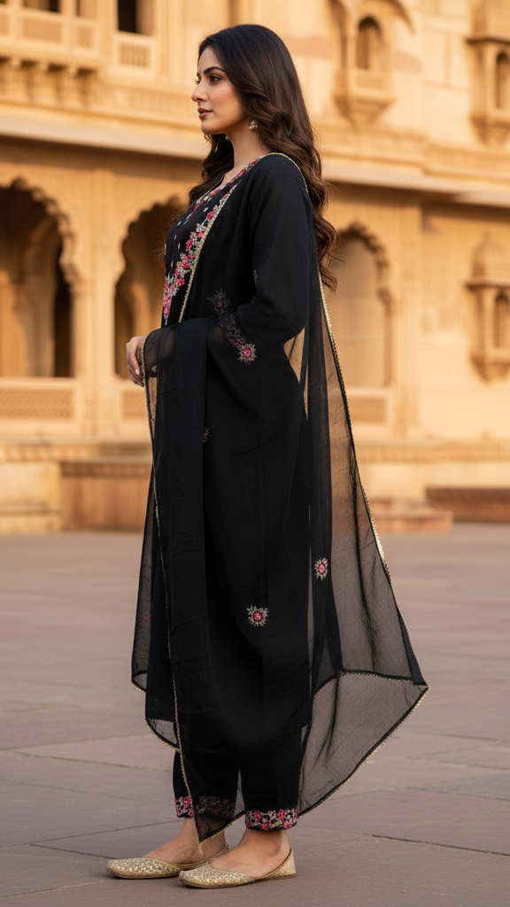 Sophisticated Black Embroidered Kurta Set with Multi-Color Thread Work and Sheer Dupatta