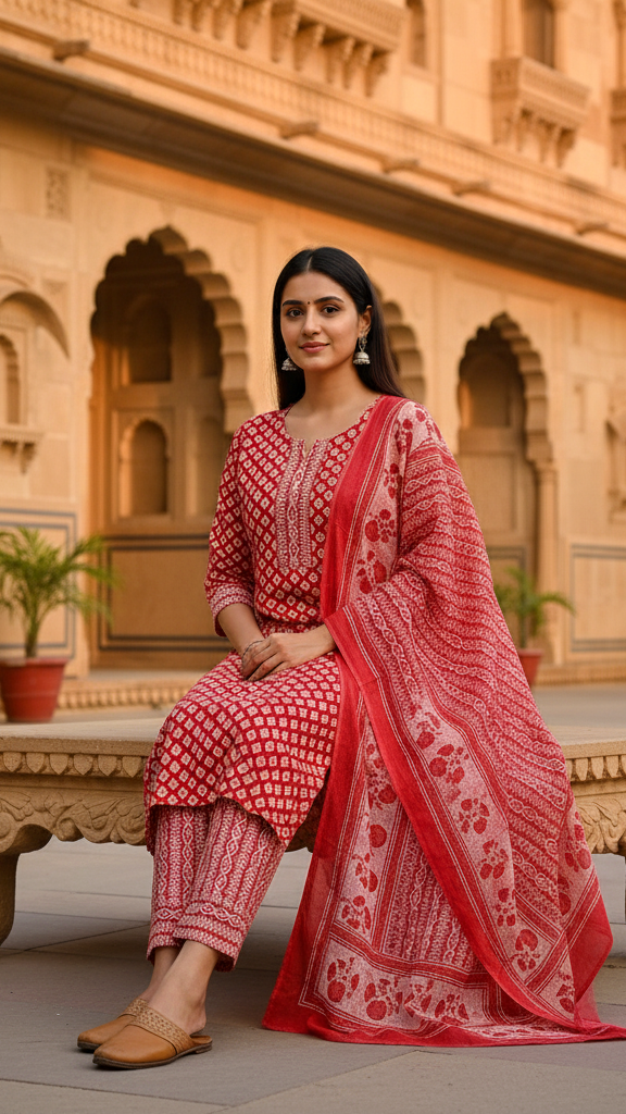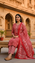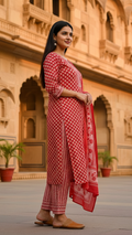 Vibrant Red & White All-Over Block Print Cotton Kurta Set with Border Detail Dupatta