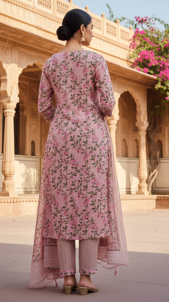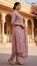 Dusty Pink Floral Printed Kurta Set with Mirror Work Embroidered Yoke and Dupatta