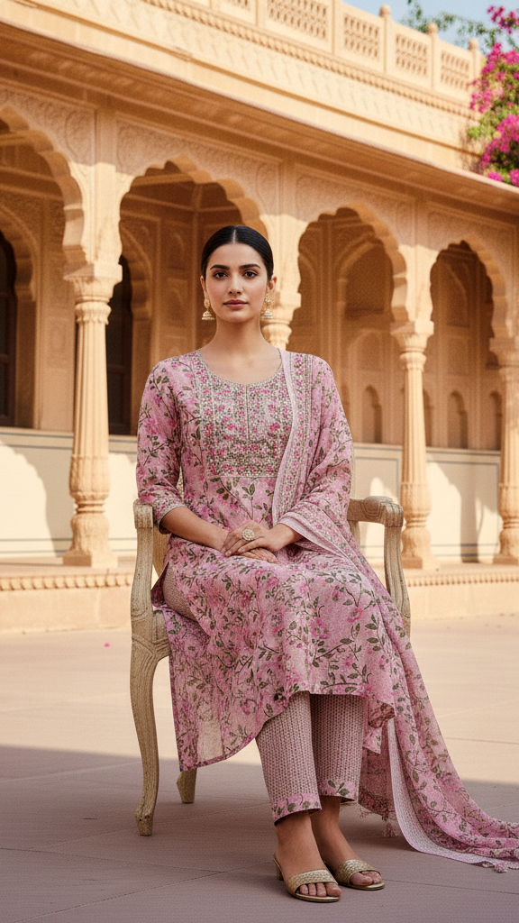 The straight-cut kurta features (mention a specific detail like subtle embroidery/a print pattern/a simple round neckline) and is paired with matching/contrast pants or palazzos for a streamlined, elegant look. The lightweight, soft fabric drapes beautifully, making it an ideal choice for long workdays, casual outings, or relaxed festive occasions