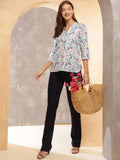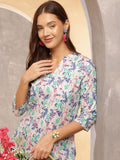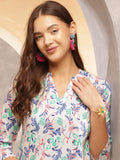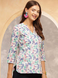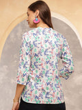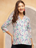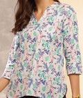 Botanic Charm Cotton Tunic Top – White with Green & Blue Floral Print