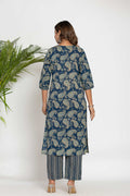 Navy Blue & Beige Paisley Printed Cotton Suit Set - Kurti, Pant & Dupatta